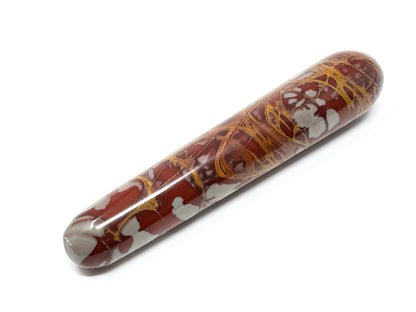 The raw, natural Noreena Jasper Stone has been cut and polished by hand into a sleek crystal wand shape: more specifically, into a crystal massage wand shape with two rounded edges, perfect for crystal healing massages.