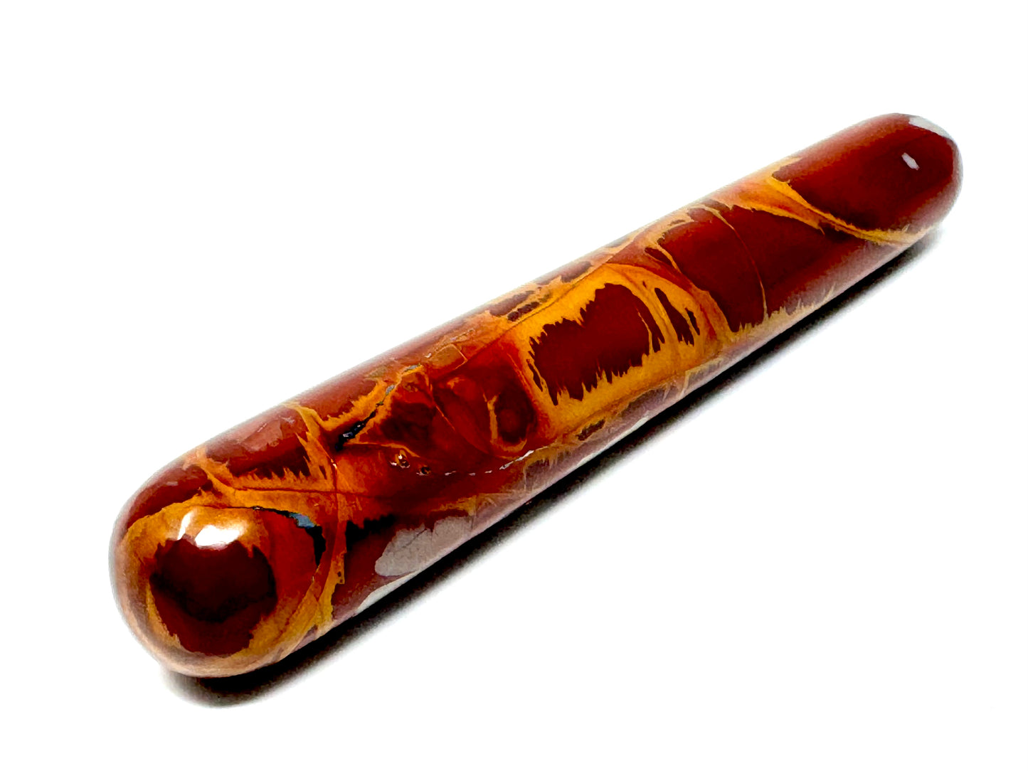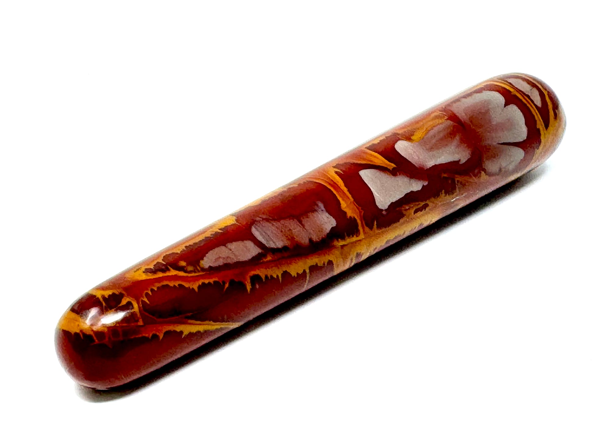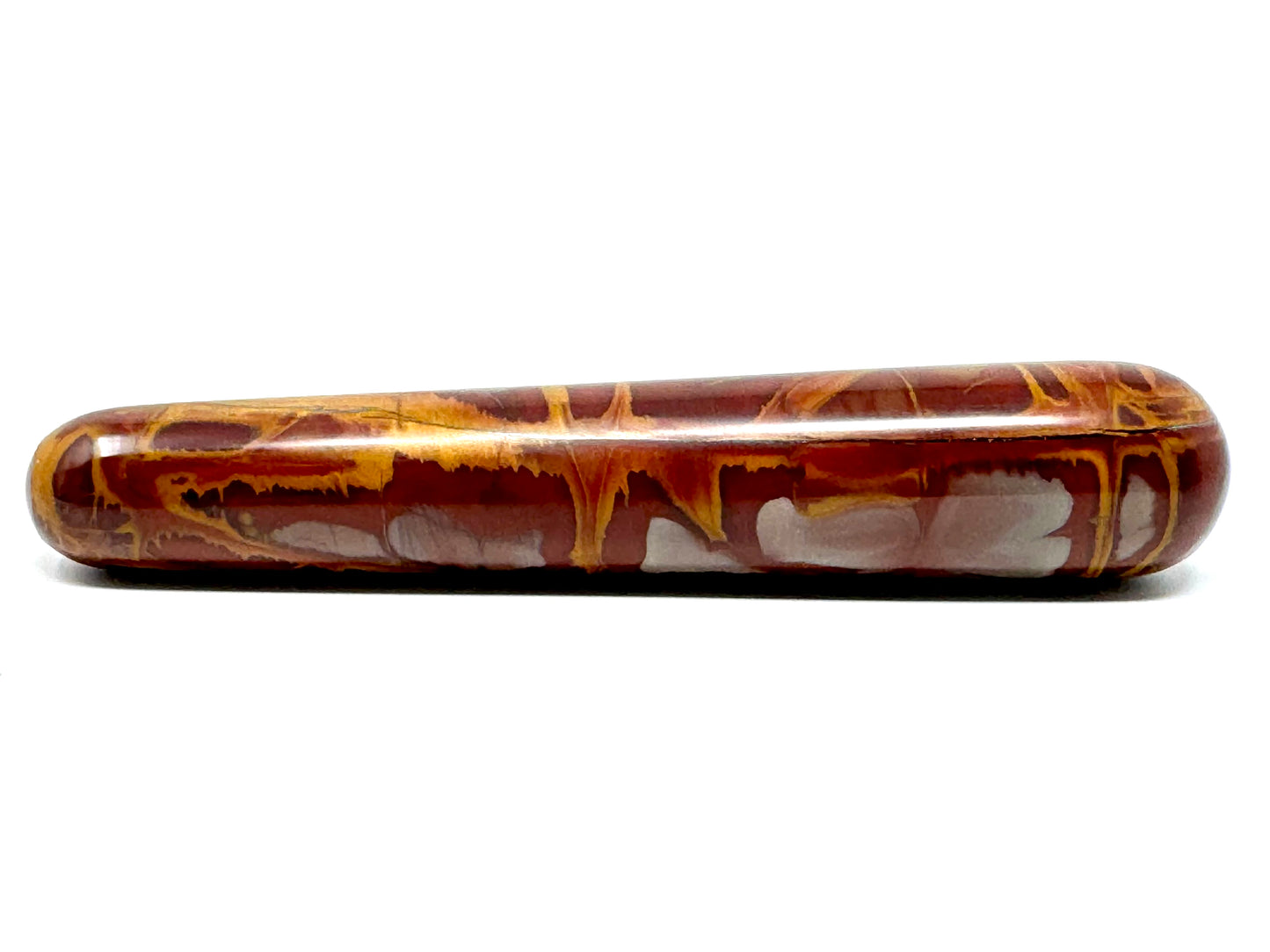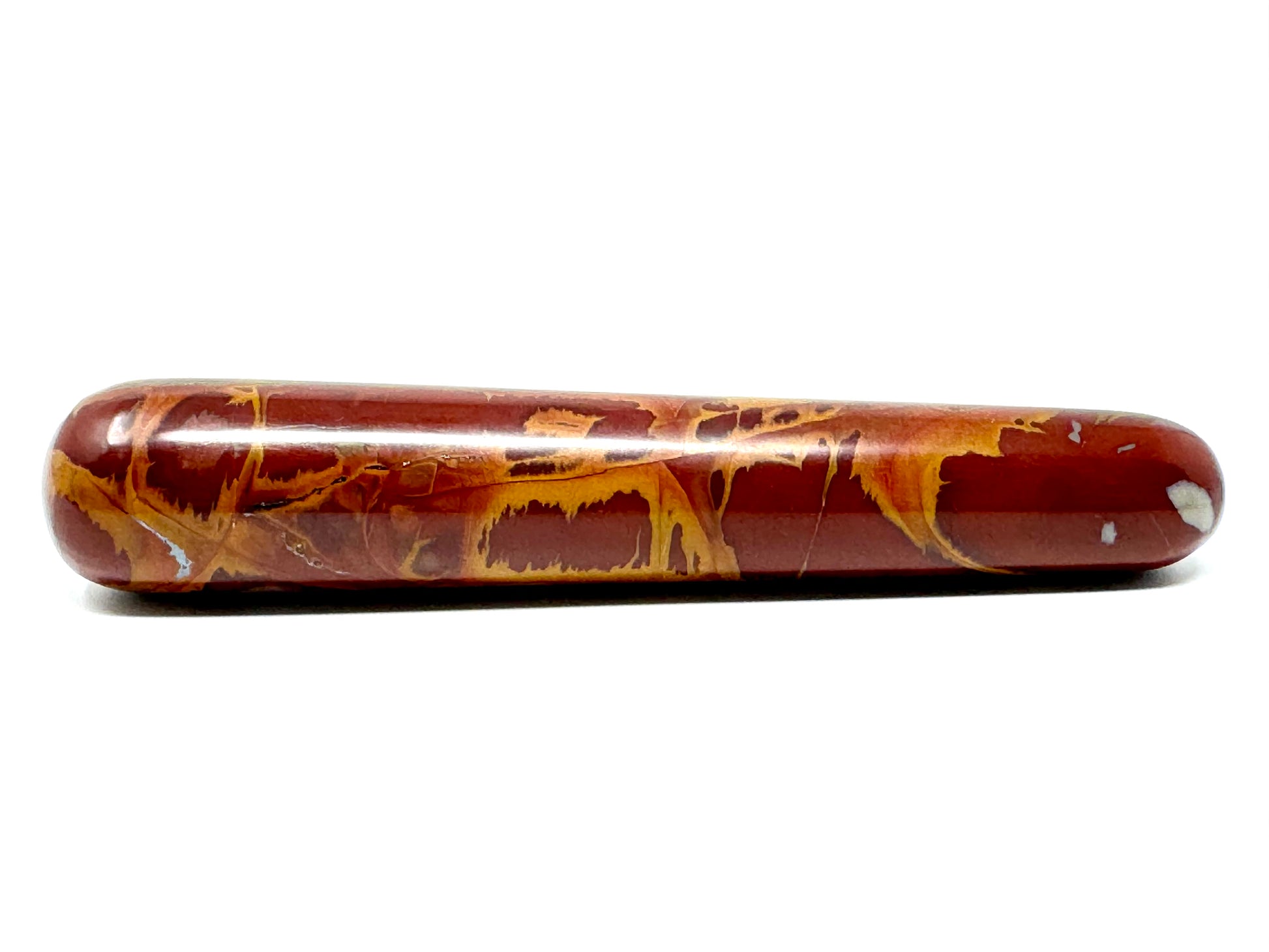 The raw, natural Noreena Jasper Stone has been cut and polished by hand into a sleek crystal wand shape: more specifically, into a crystal massage wand shape with two rounded edges, perfect for crystal healing massages.