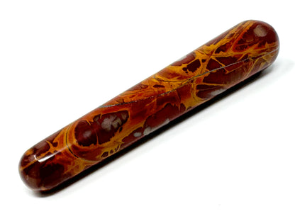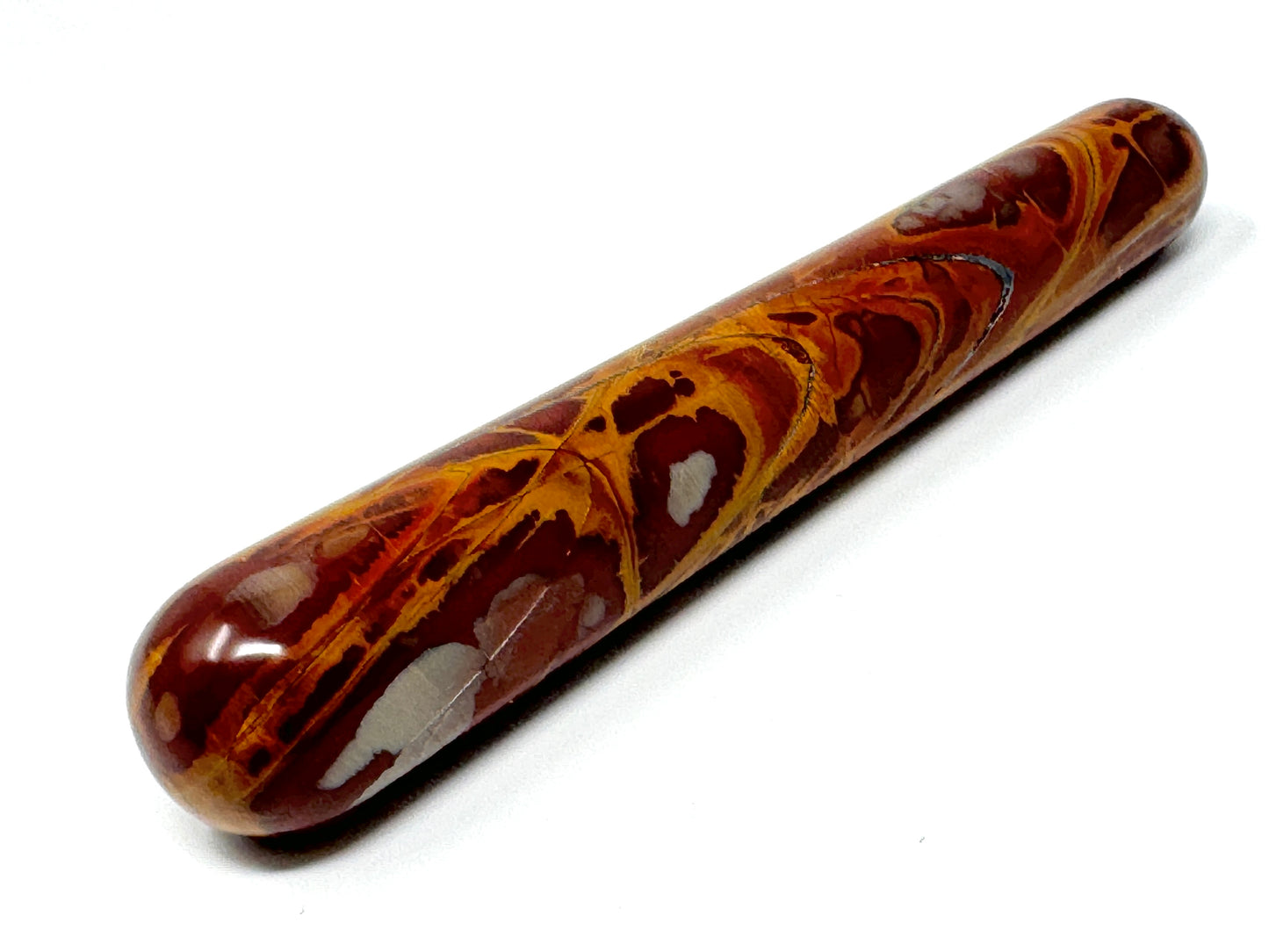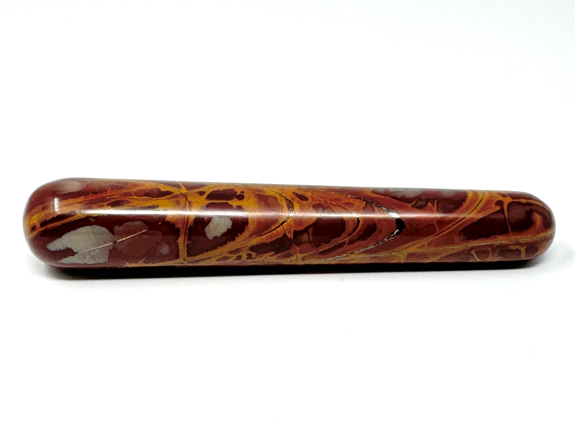 The raw, natural Noreena Jasper Stone has been cut and polished by hand into a sleek crystal wand shape: more specifically, into a crystal massage wand shape with two rounded edges, perfect for crystal healing massages.