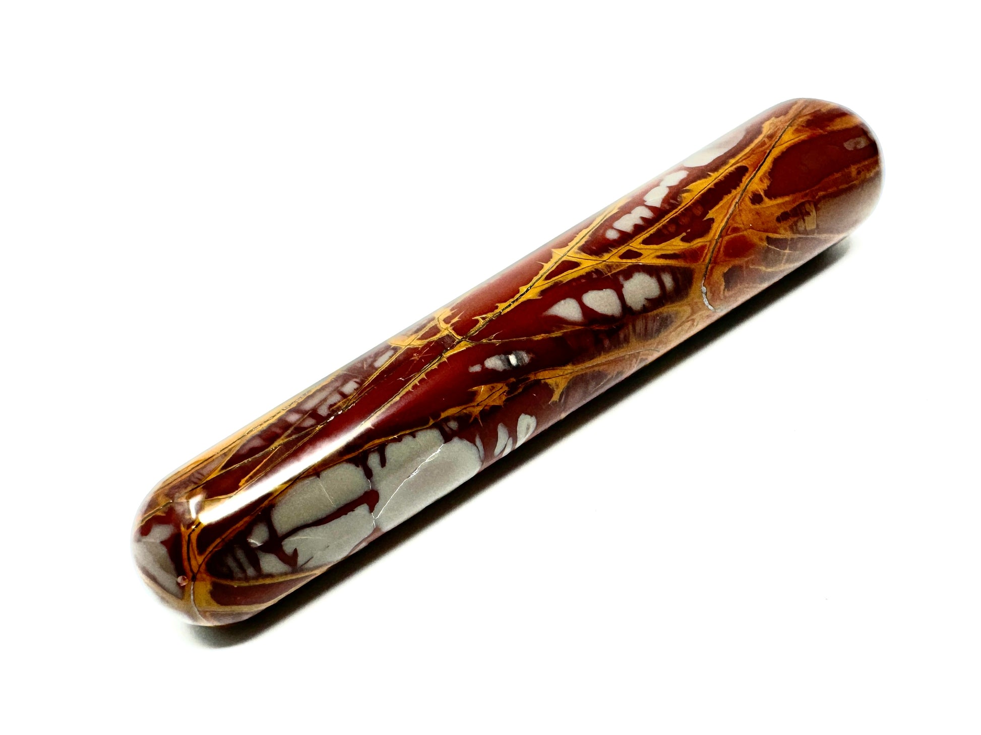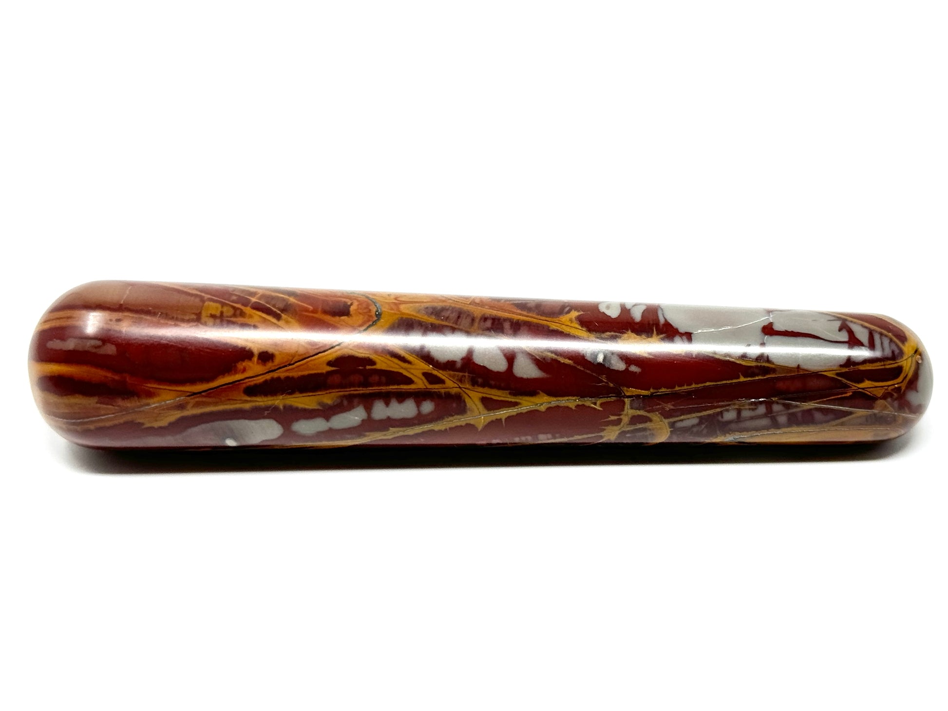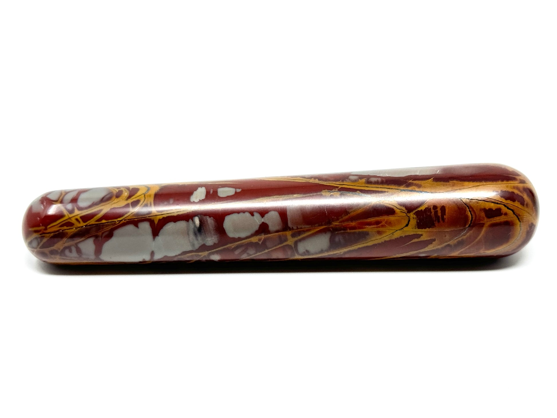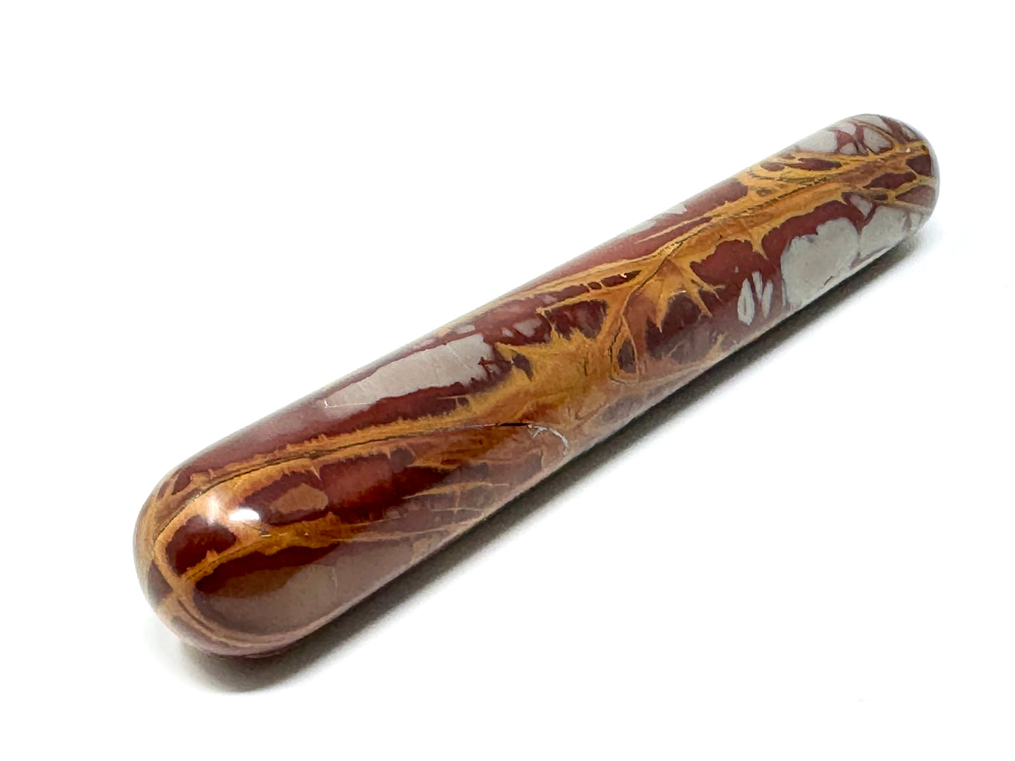 The raw, natural Noreena Jasper Stone has been cut and polished by hand into a sleek crystal wand shape: more specifically, into a crystal massage wand shape with two rounded edges, perfect for crystal healing massages.