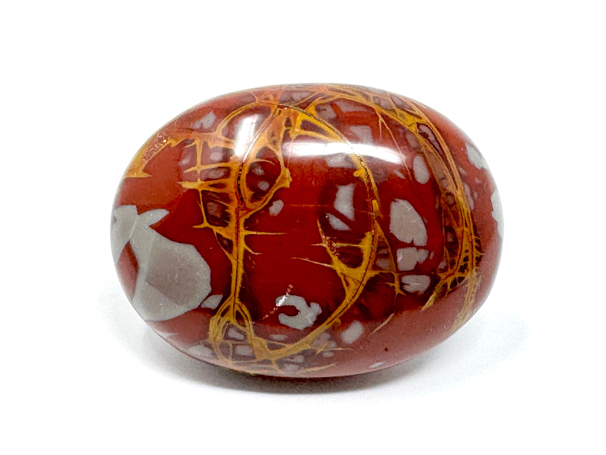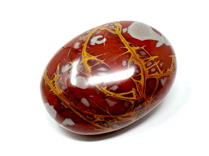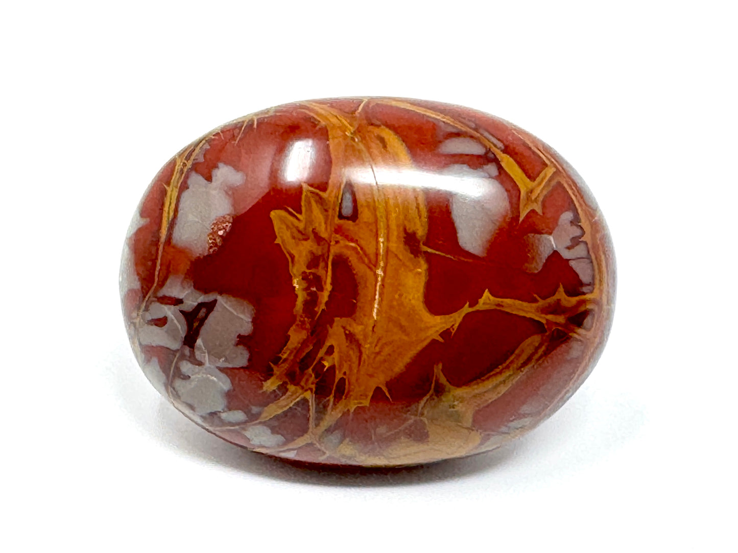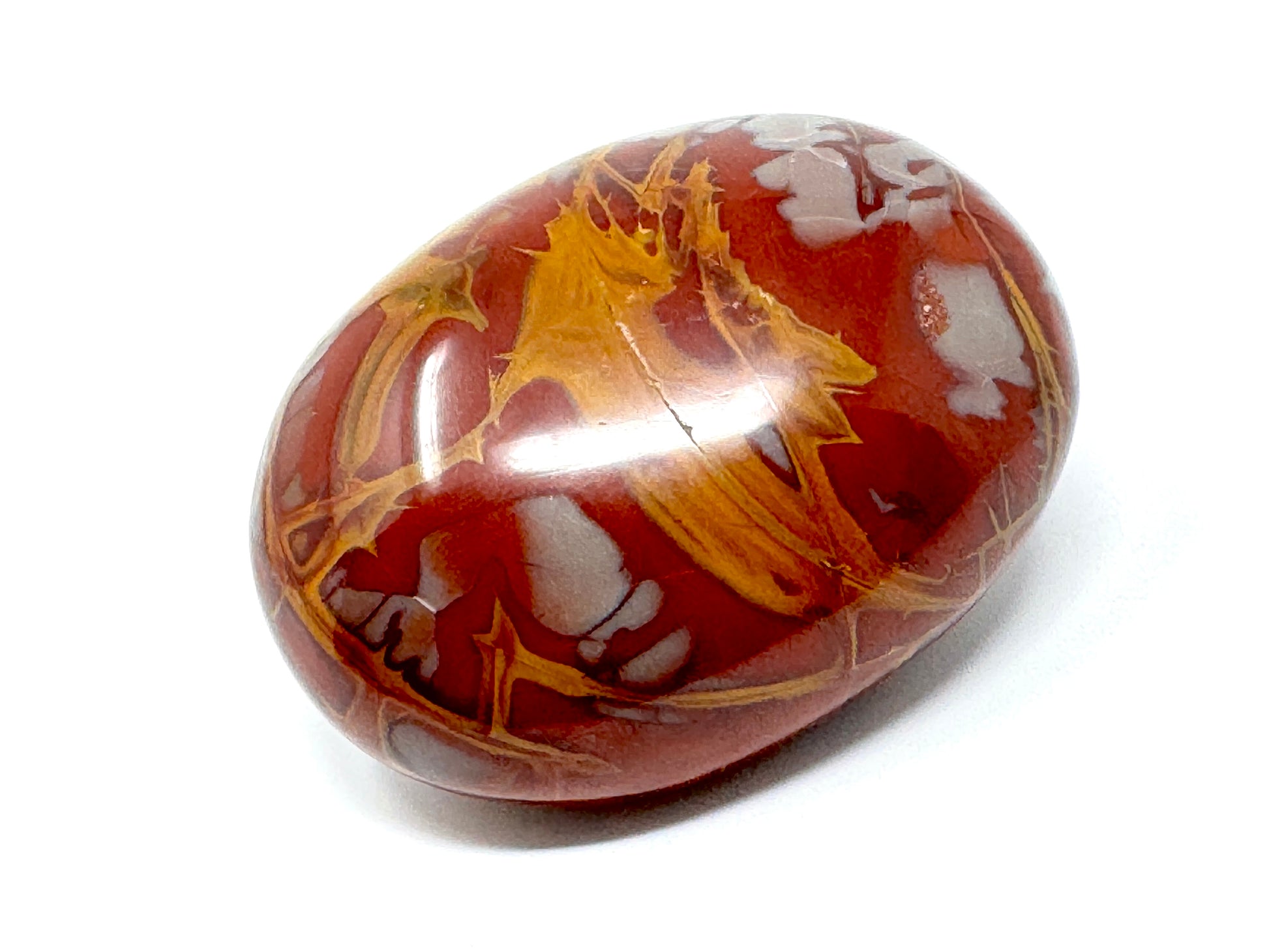 This striking Noreena Jasper Palm Stone showcases a stunning array of rich rust-red, deep maroon, fiery orange, mustard yellow, subtle cream and stone grey hues, which complement each other beautifully.