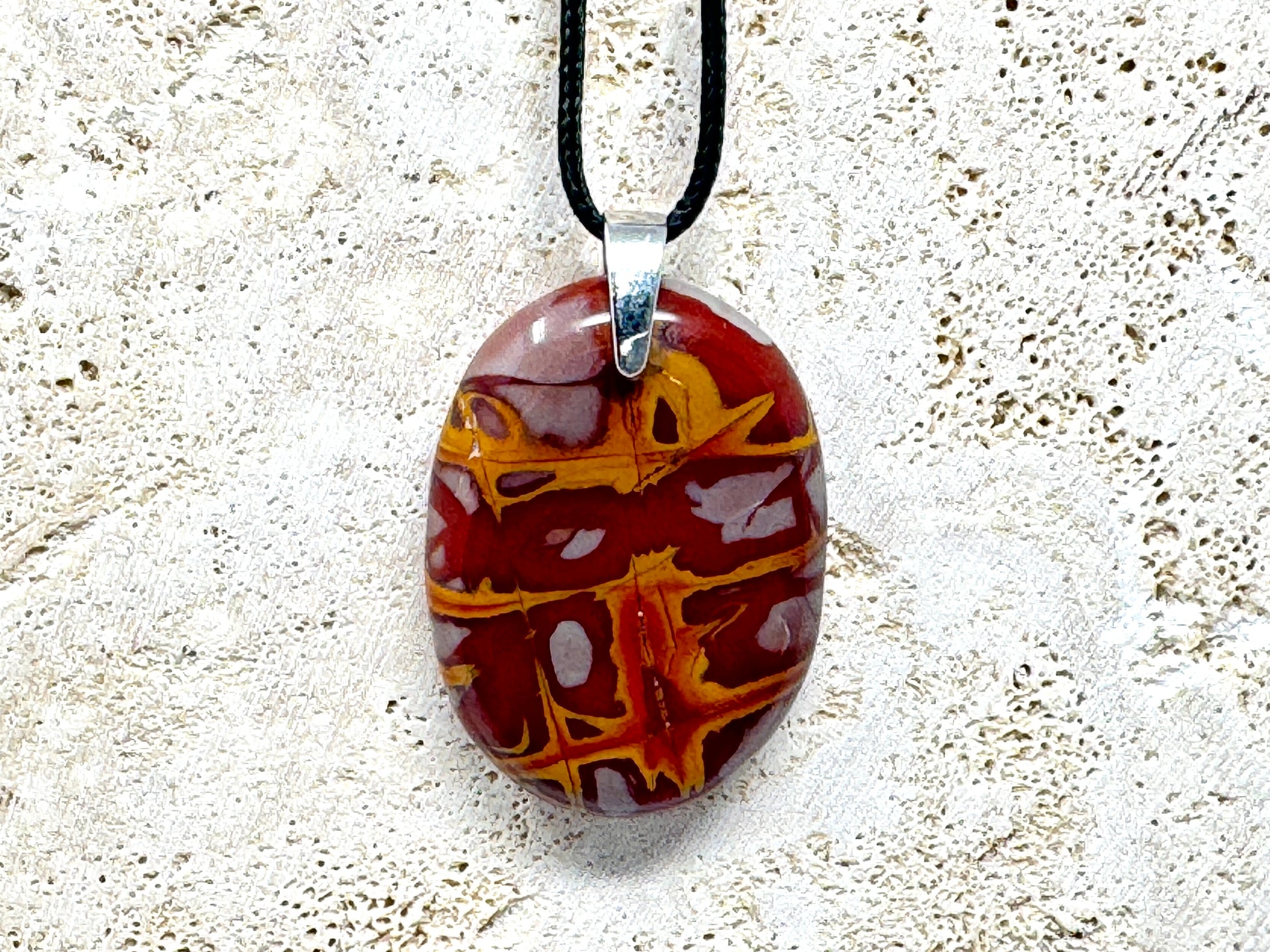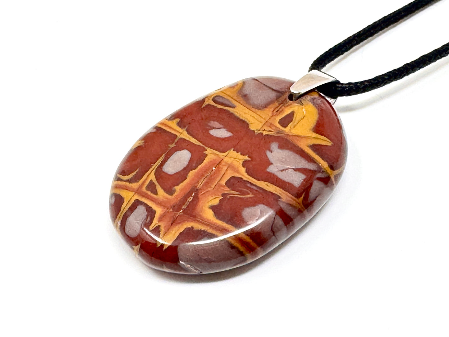 This striking Noreena Jasper Crystal Pendant showcases a stunning array of rich rust-red, deep maroon, fiery orange, mustard yellow, subtle cream and stone grey hues, which complement each other beautifully.