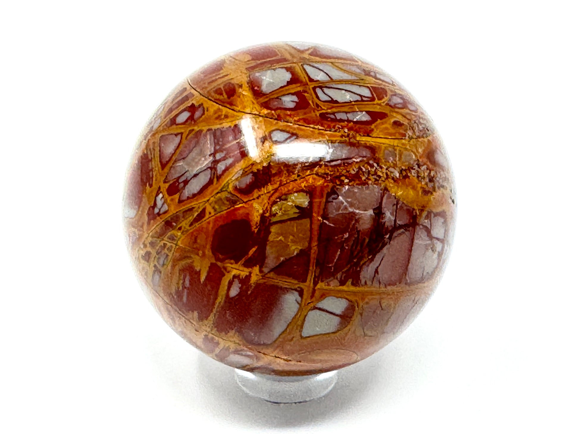 This striking Noreena Jasper Sphere showcases a stunning array of rich rust-red, deep maroon, fiery orange, mustard yellow, subtle cream and stone grey hues, which complement each other beautifully.