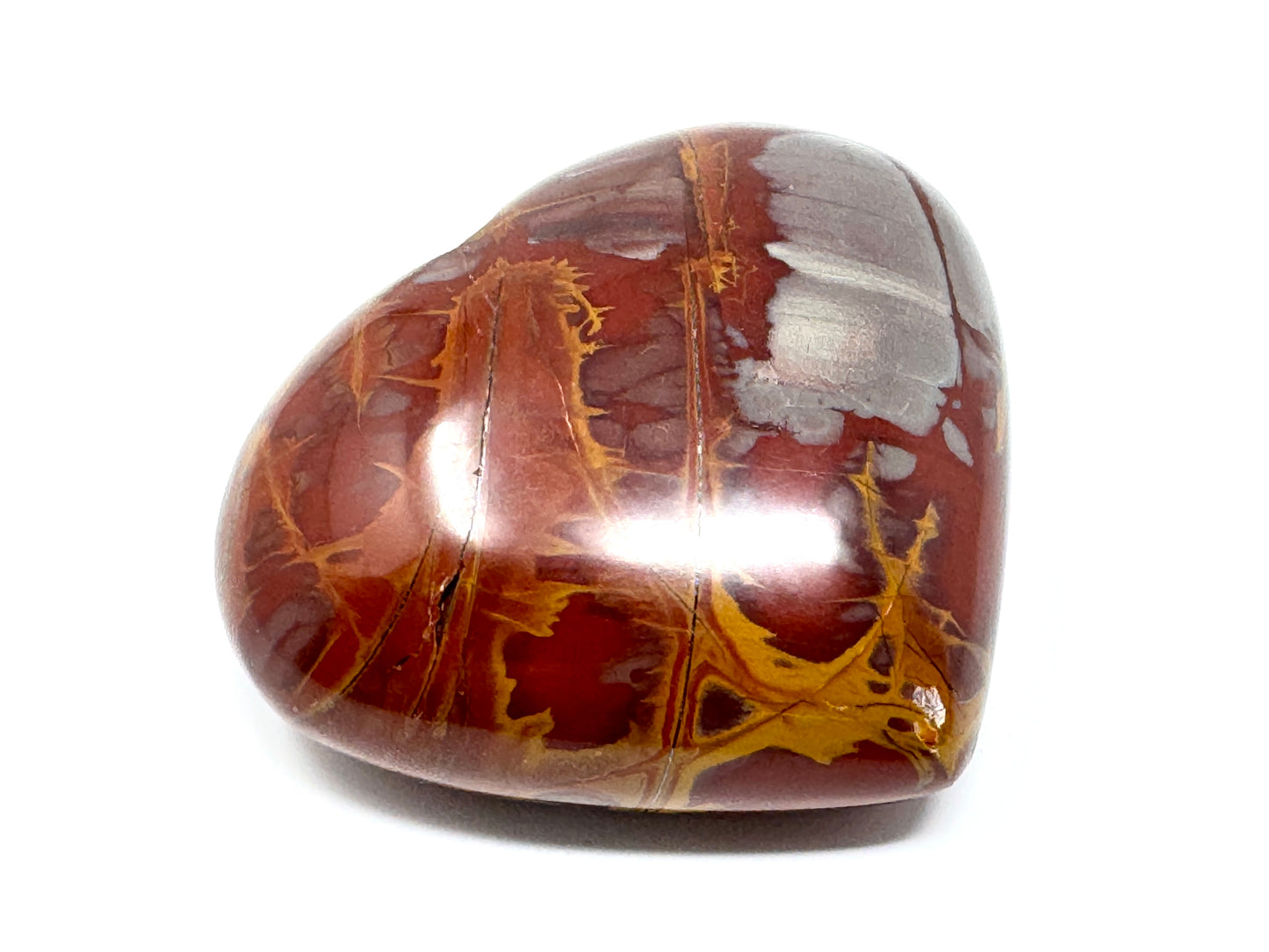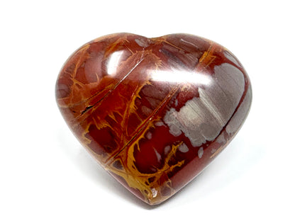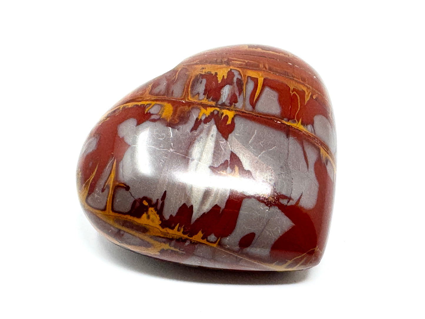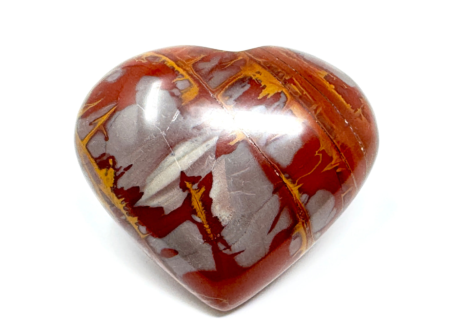 This striking Noreena Jasper Heart Crystal showcases a stunning array of rich rust-red, deep maroon, fiery orange, mustard yellow, subtle cream and stone grey hues, which complement each other beautifully.