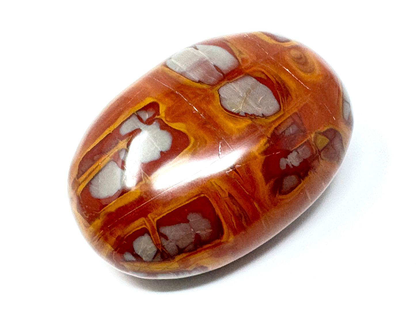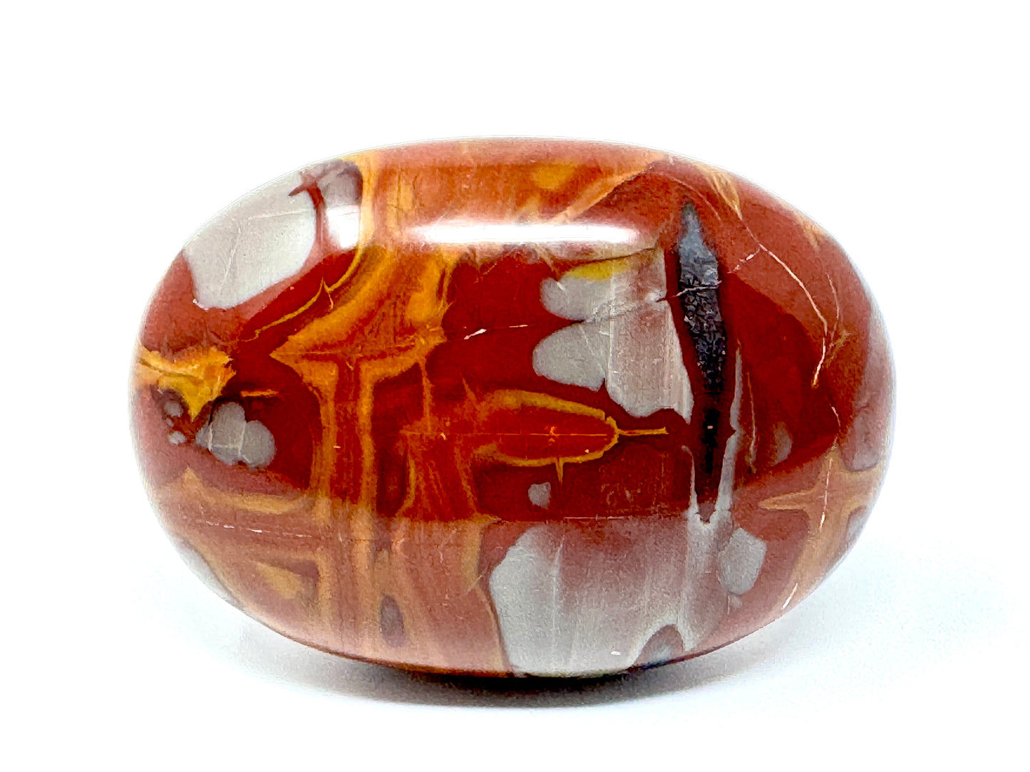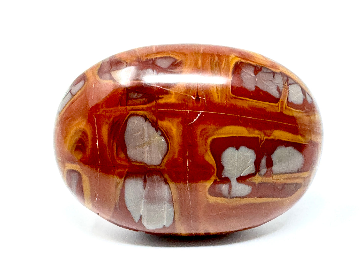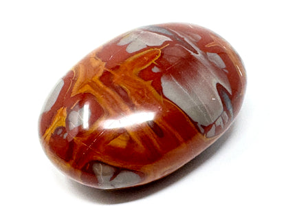 This striking Noreena Jasper Palm Stone showcases a stunning array of rich rust-red, deep maroon, fiery orange, mustard yellow, subtle cream and stone grey hues, which complement each other beautifully.