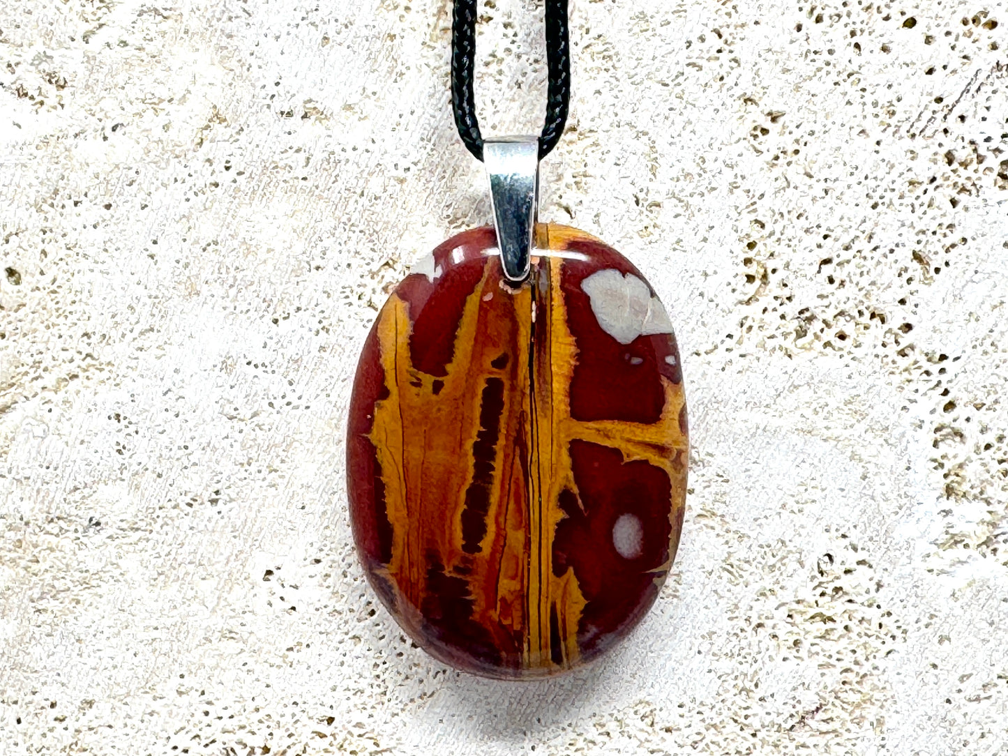 This striking Noreena Jasper Crystal Pendant showcases a stunning array of rich rust-red, deep maroon, fiery orange, mustard yellow, subtle cream and stone grey hues, which complement each other beautifully.