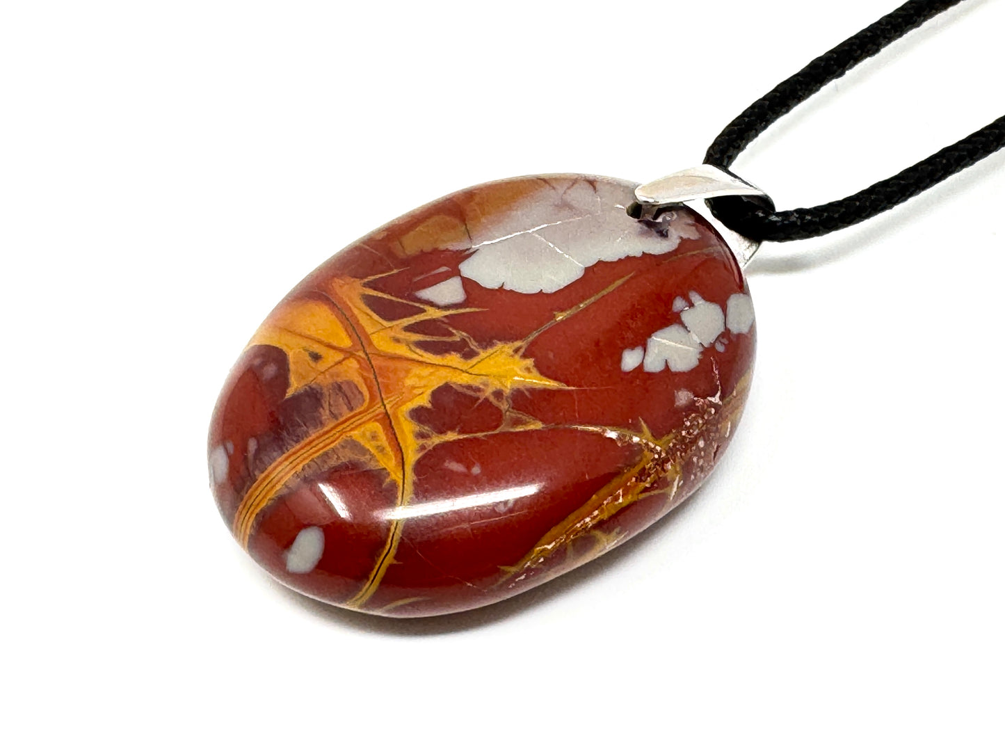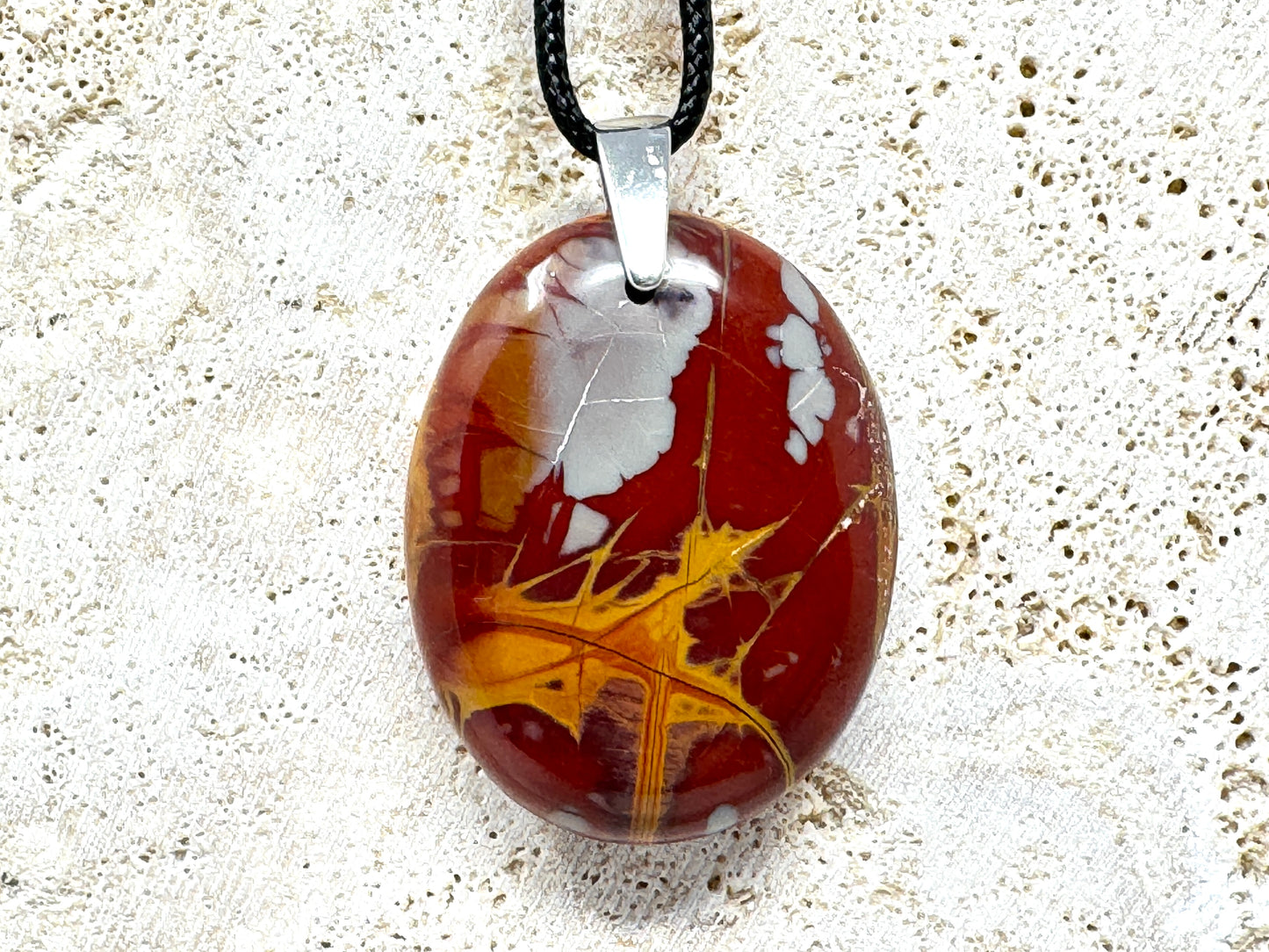 This striking Noreena Jasper Crystal Pendant showcases a stunning array of rich rust-red, deep maroon, fiery orange, mustard yellow, subtle cream and stone grey hues, which complement each other beautifully.