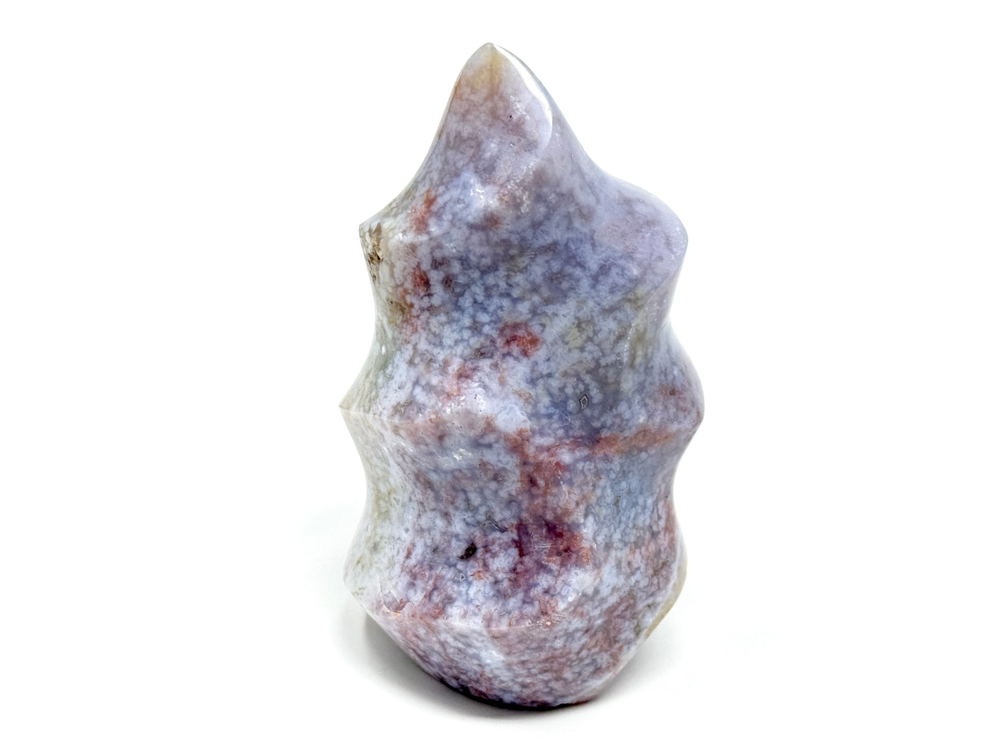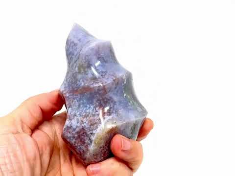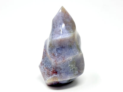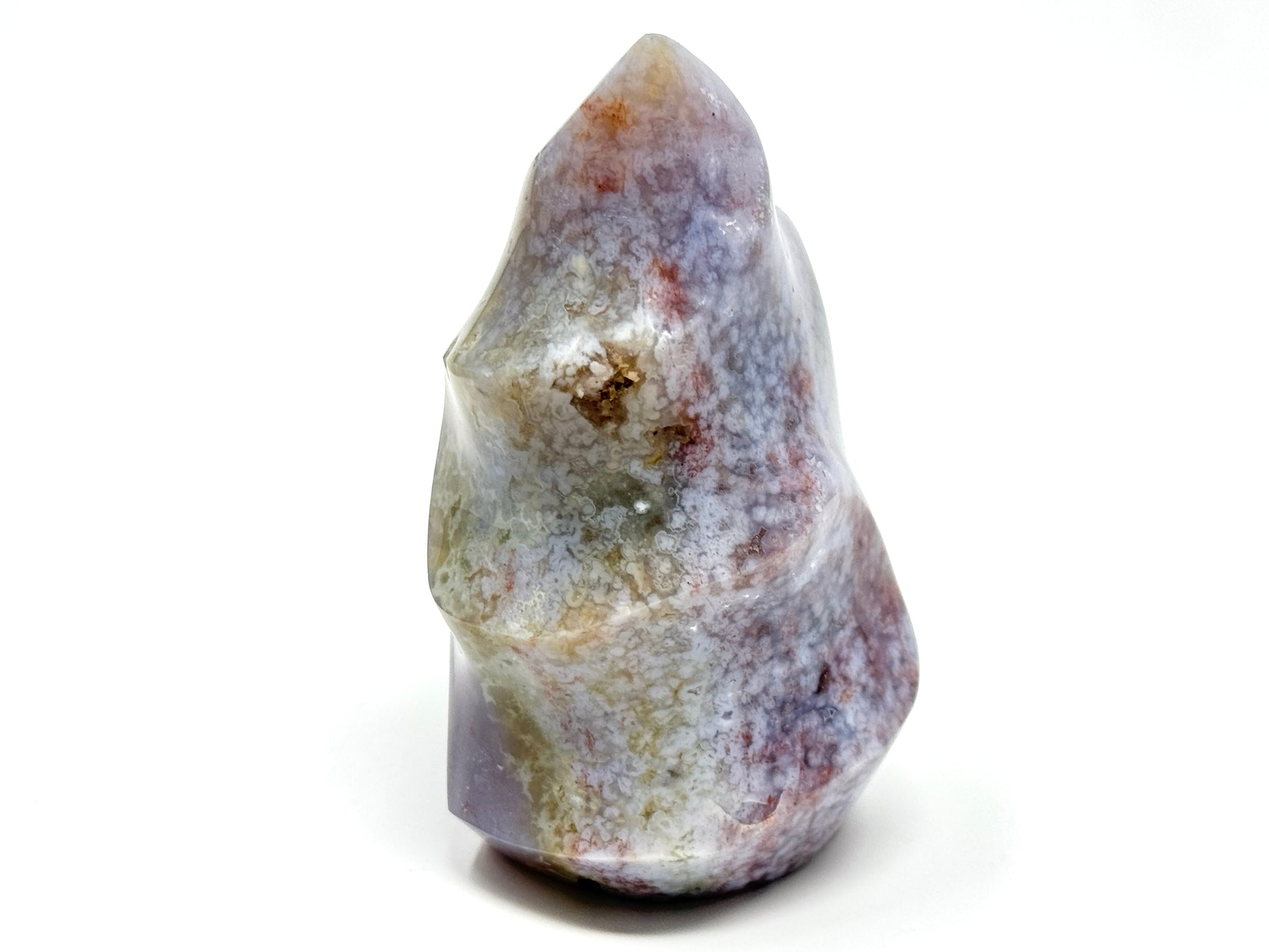 This gorgeous Ocean Jasper Crystal Flame (Ocean Jasper Flame Shape) measures 11cm tall and displays stunning swirls and orbs of grey, lilac-purple, red, and yellow-brown amongst other hues.