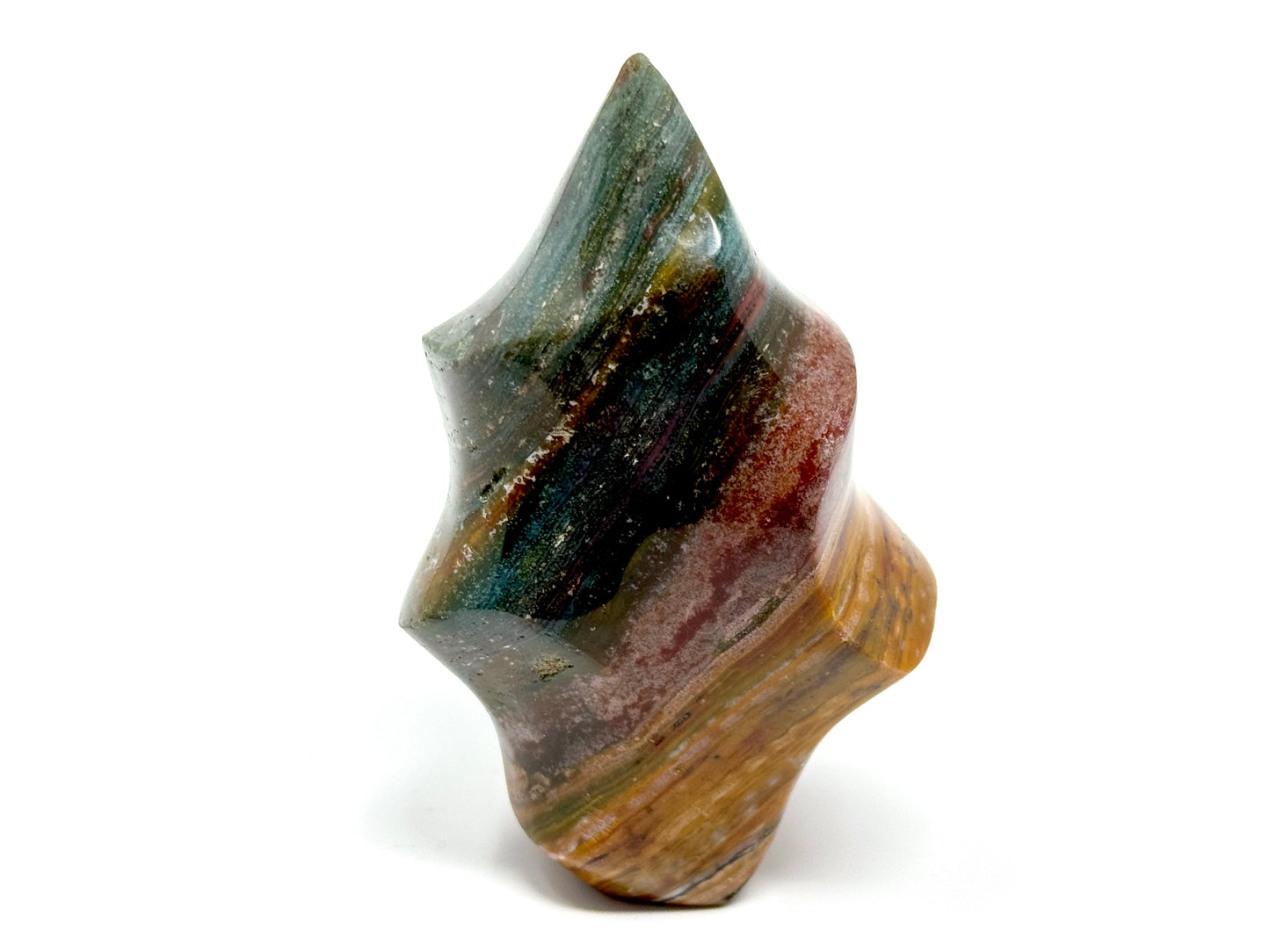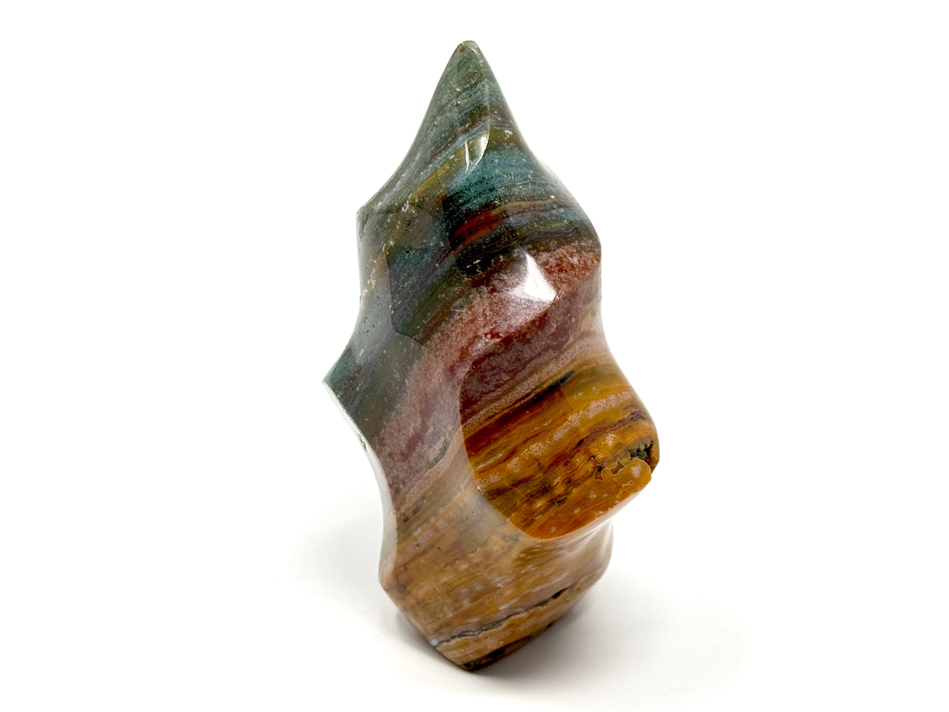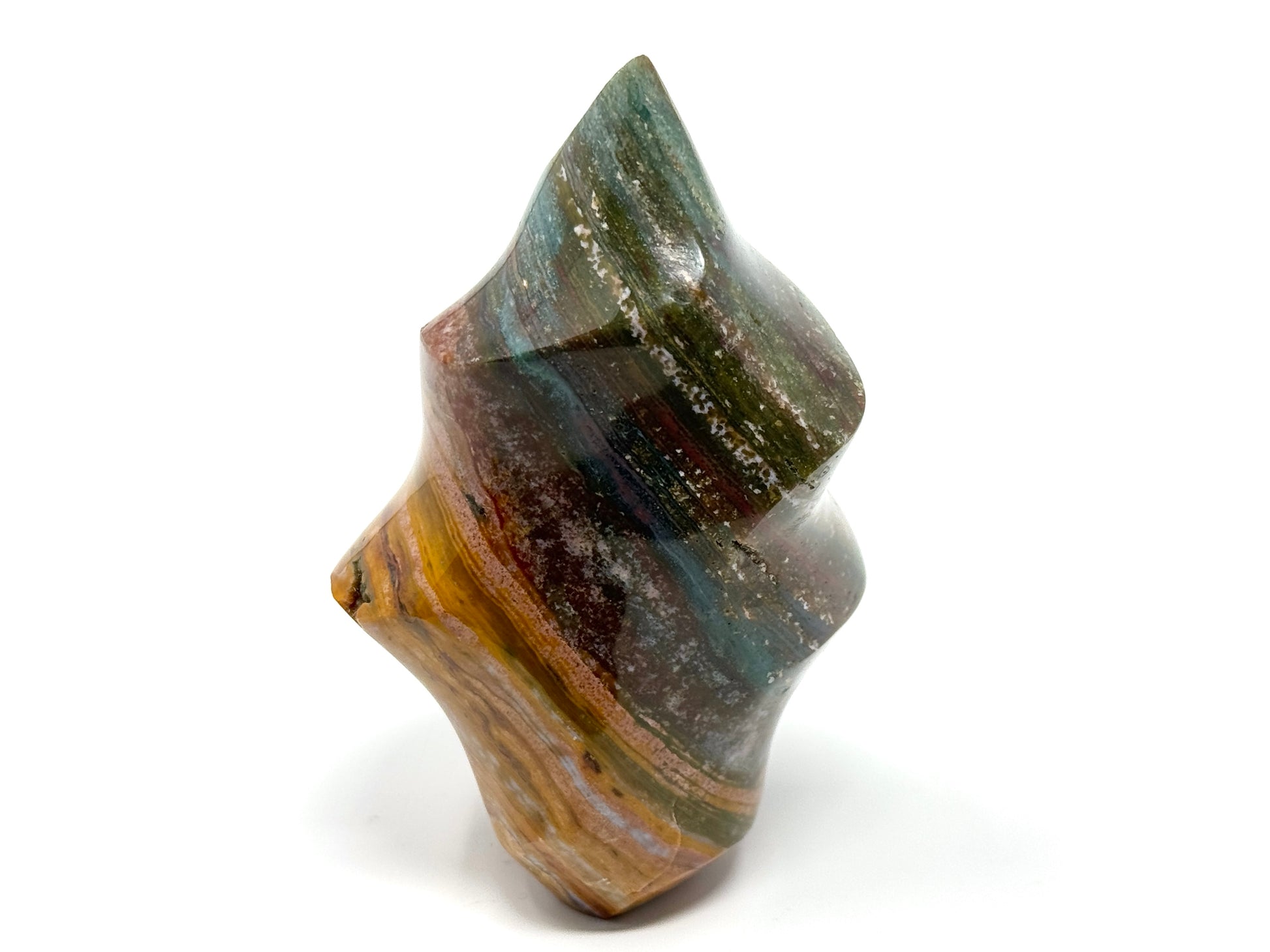 This gorgeous Ocean Jasper Crystal Flame (Ocean Jasper Flame Shape) measures 10.1cm tall and displays stunning swirls and orbs of red, green, yellow, orange, and blue amongst other hues.
