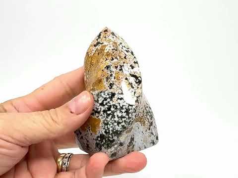 This gorgeous Ocean Jasper Crystal Flame (Ocean Jasper Flame Shape) measures 9cm tall and displays stunning swirls and orbs of orange-brown, black, grey, and white amongst other hues.