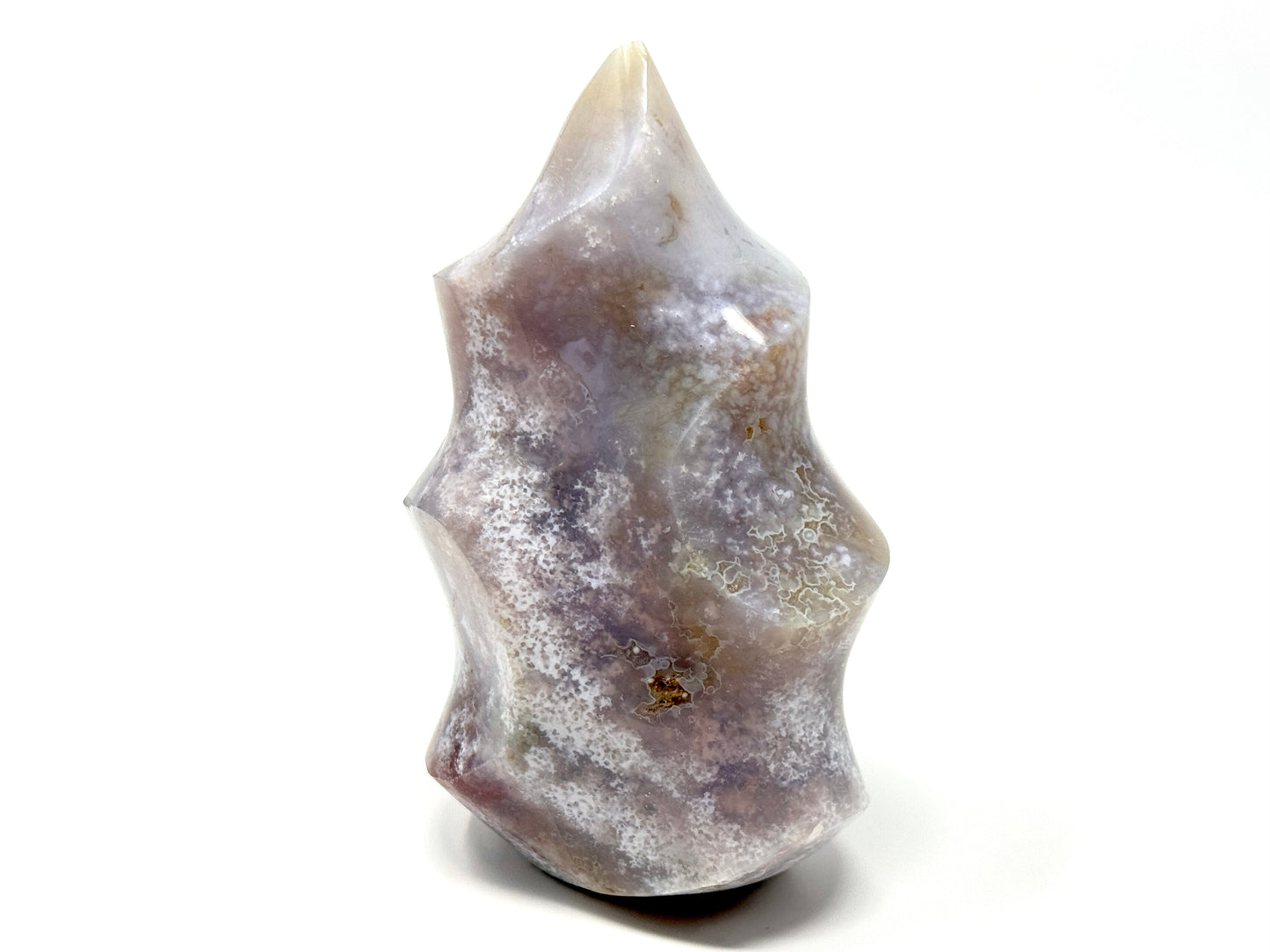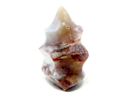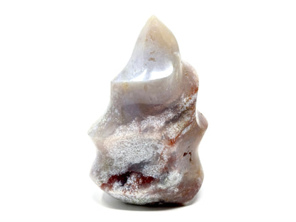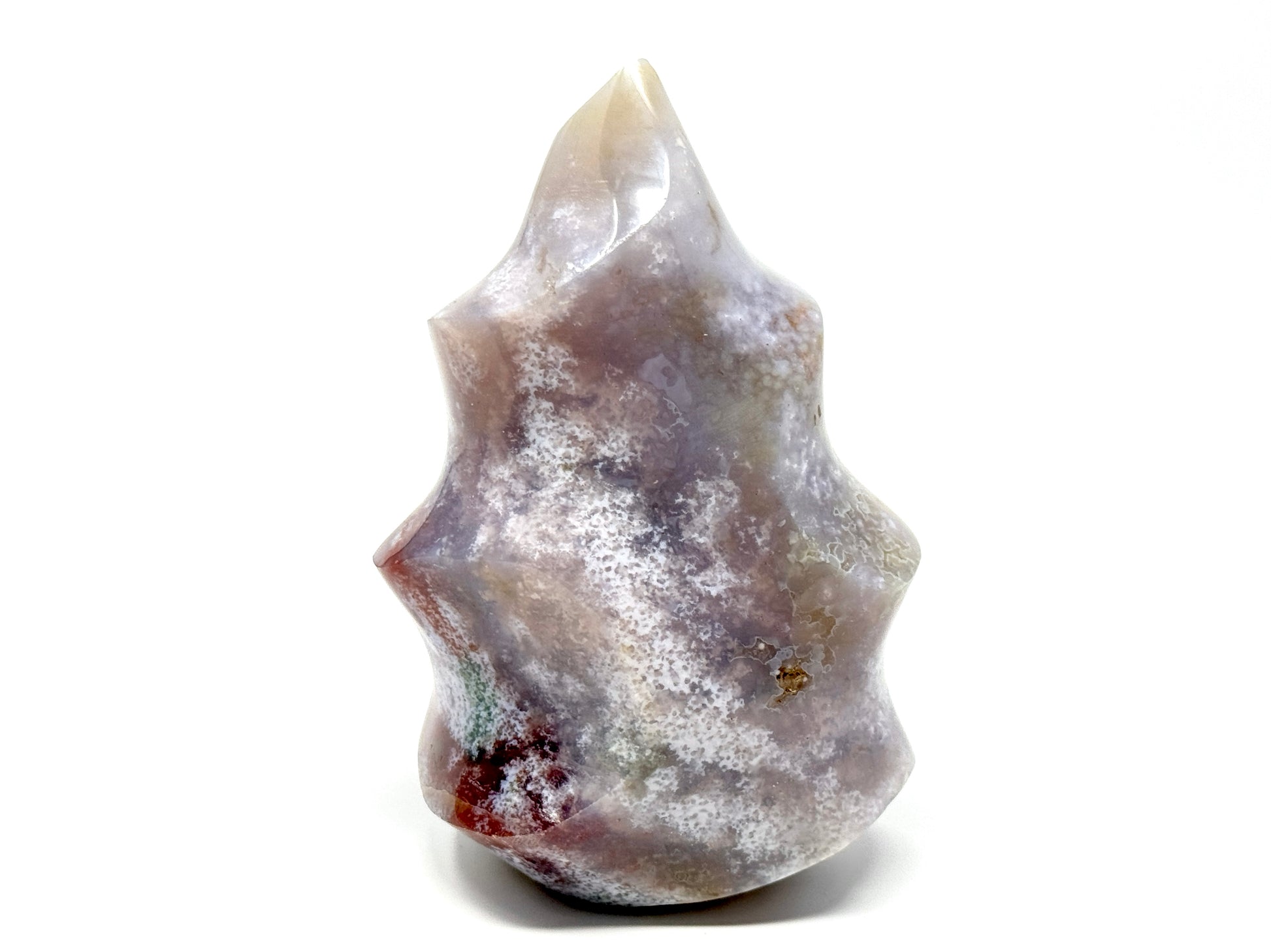 This gorgeous Ocean Jasper Crystal Flame (Ocean Jasper Flame Shape) measures 11.6cm tall and displays stunning swirls and orbs of grey-purple, red, orange-brown, and white, amongst other colours.