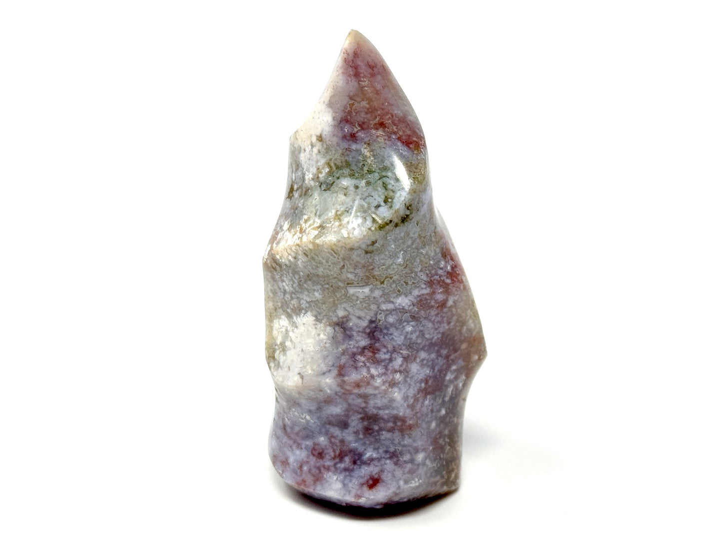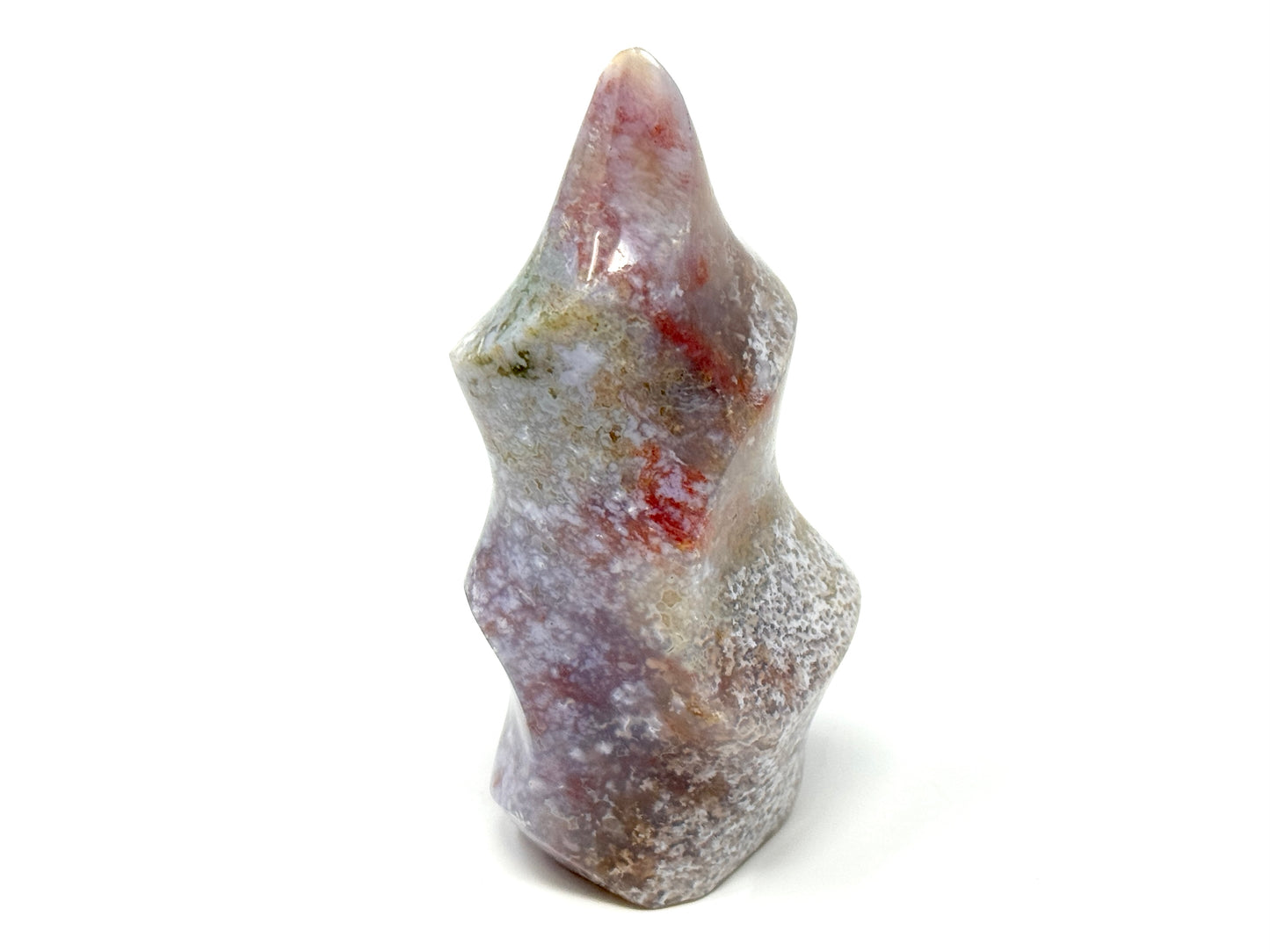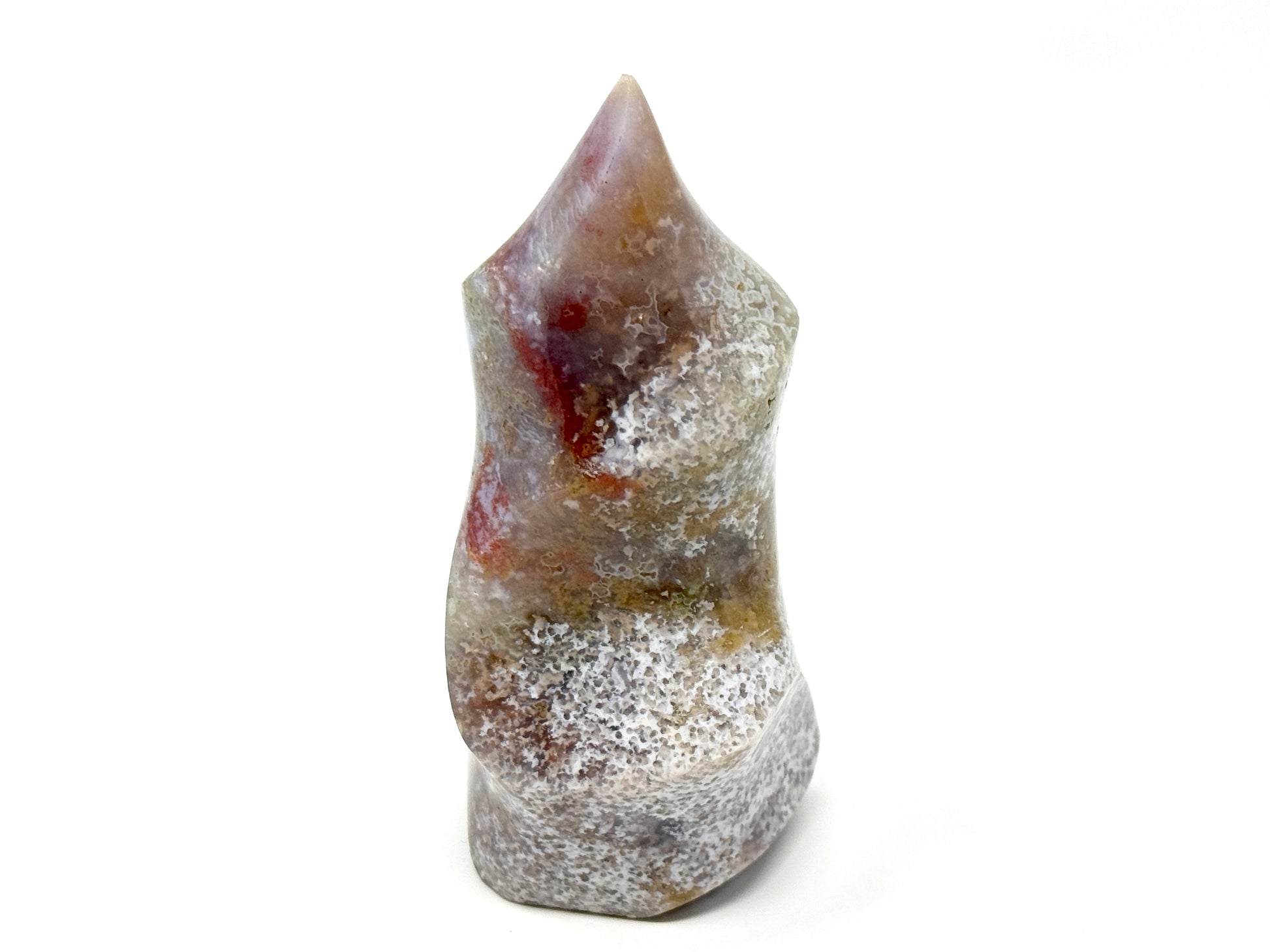 This gorgeous Ocean Jasper Crystal Flame (Ocean Jasper Flame Shape) measures 9.4cm tall and displays stunning swirls and orbs of grey-purple, red, orange-brown, and white, amongst other colours.