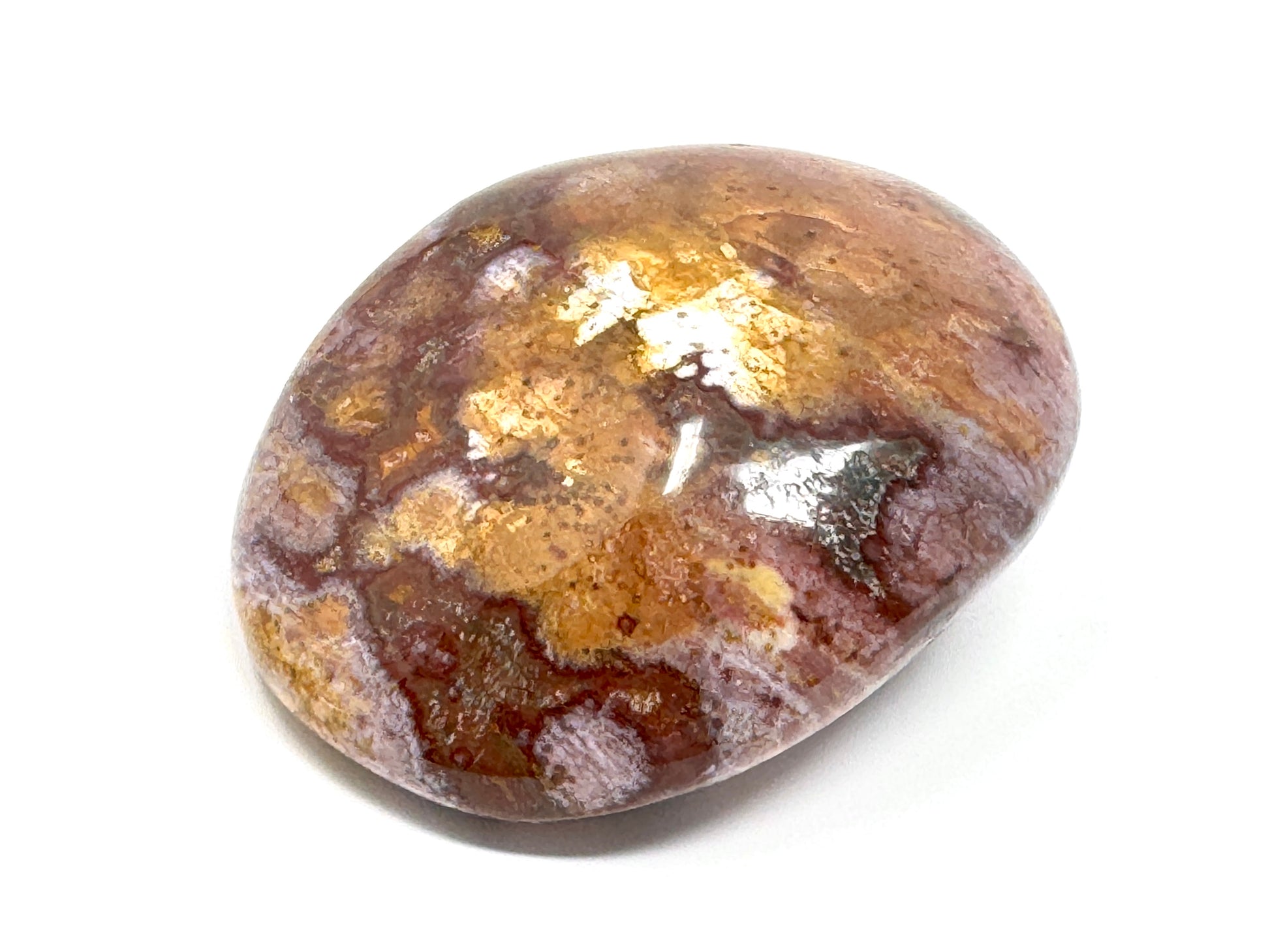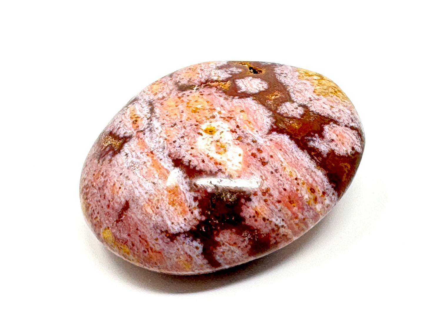 This gorgeous Ocean Jasper Pebble measures 7cm long and displays stunning swirls and orbs of red, orange, pink, and brown.