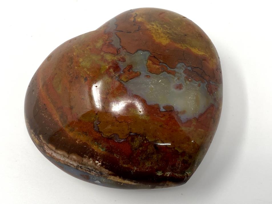 This gorgeous Large Ocean Jasper Heart measures 8.4cm wide and displays stunning swirls of red, orange, brown, and grey.