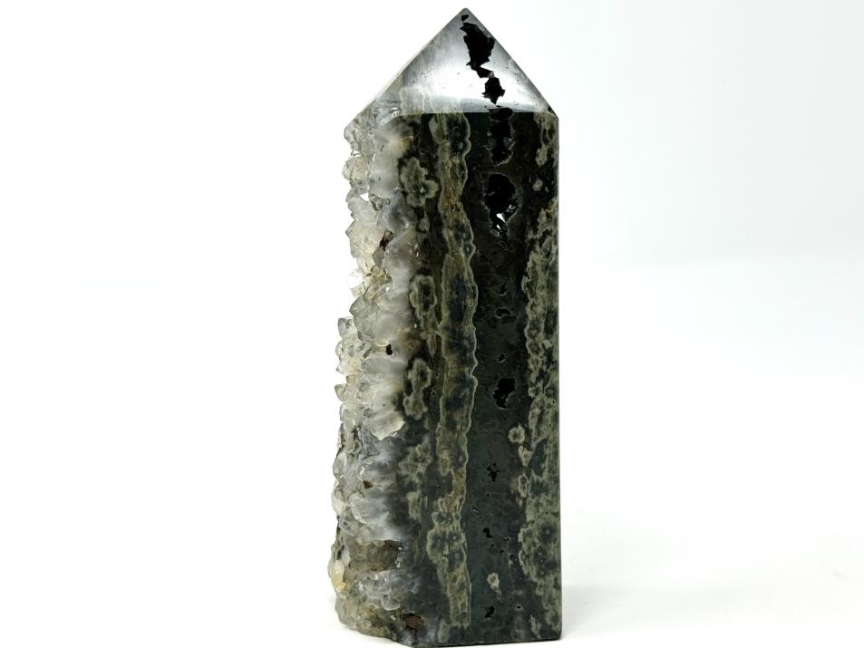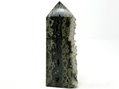 This beautiful, Large Druzy Ocean Jasper Wave Point measures 17cm tall and displays stunning swirls and orbs of dark green, black, white, and grey.