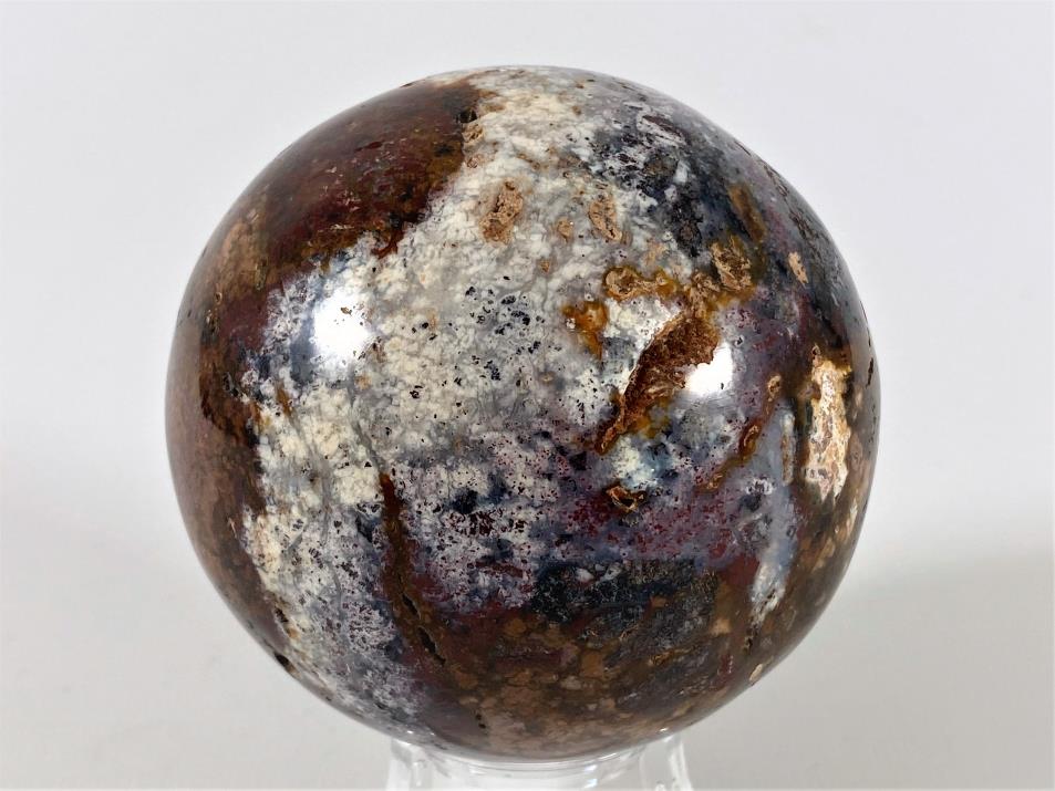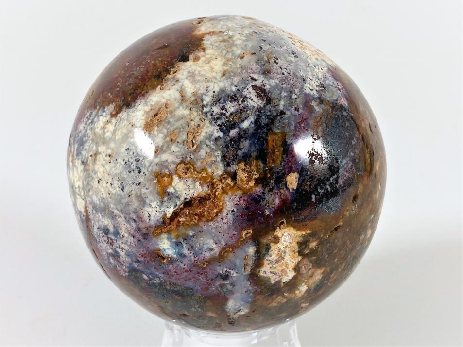 This gorgeous Ocean Jasper Sphere measures 7.4cm in diameter and displays stunning swirls of red, grey-blue, orange, caramel-brown and cream.