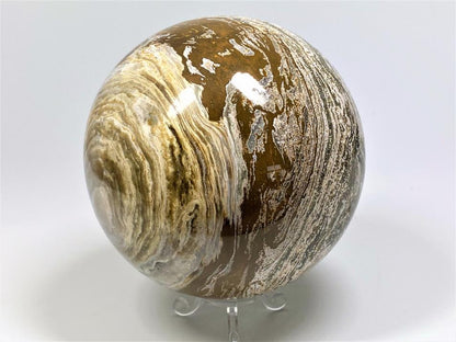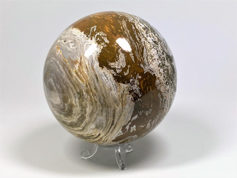 This gorgeous Large Ocean Jasper Sphere measures 11.3cm in diameter and displays stunning swirls of rich caramel-brown and cream colours.