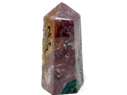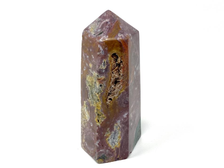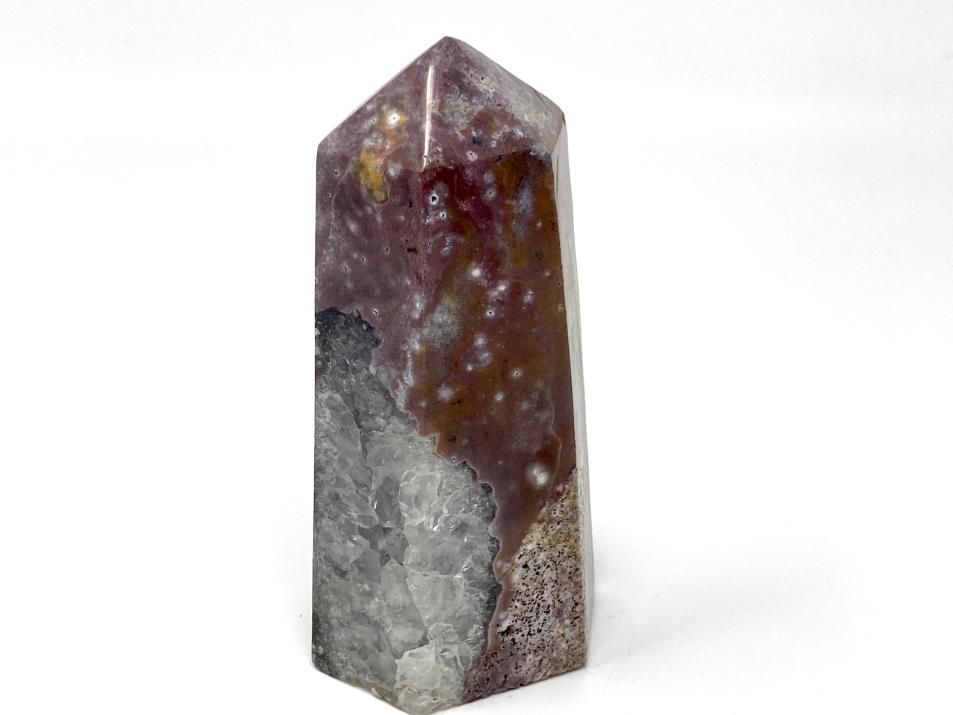 This gorgeous Large Ocean Jasper Tower (Large Ocean Jasper Obelisk) measures 16.5cm tall and displays stunning swirls and orbs of red, purple, pink, and orange, with hints of white, blue, and brown amongst other hues.