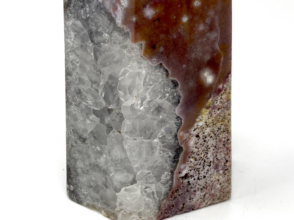 This unique Large Orbicular Jasper Tower also displays a large natural rough section and a large section of inner sparkling Quartz crystals.