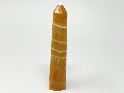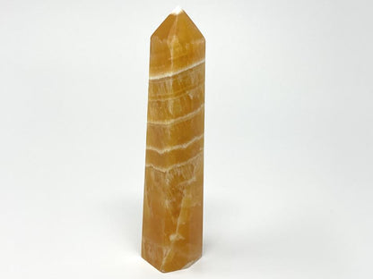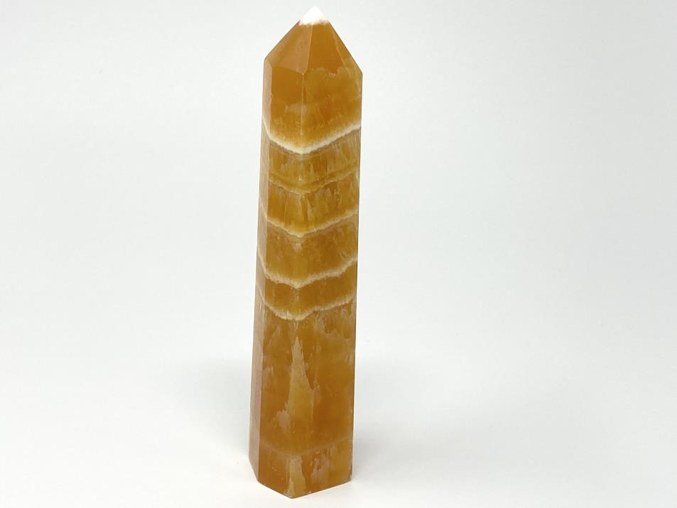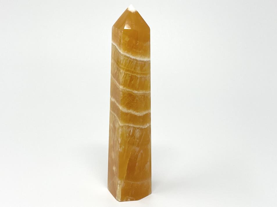 The Polished Orange Calcite Stone has been carefully cut into a smooth crystal tower shape (crystal obelisk shape) with a free-standing square base, polished faces, and sharp pointed tip.