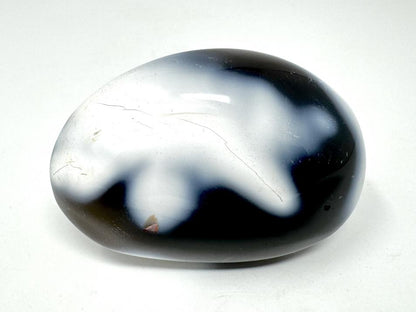 This Ocean Agate Crystal Pebble (also known as an Ocean Agate Crystal Palm Stone) displays a glossy grey-blue surface adorned with striking white patterns.