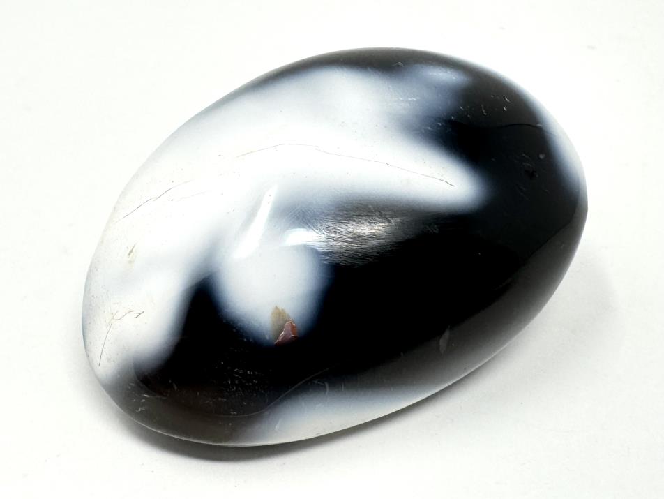 This beautiful Orca Agate Crystal Pebble (also known as an Orca Agate Crystal Palm Stone) measures 6.2cm long and has been cut and carefully polished into a smooth, tactile palm stone shape.
