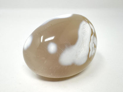 This Ocean Agate Crystal Pebble (also known as an Ocean Agate Crystal Palm Stone) displays a yellow-grey and beige-brown surface adorned with striking white patterns.