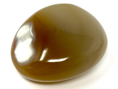 This Ocean Agate Crystal Pebble (also known as an Ocean Agate Crystal Palm Stone) displays a yellow-grey and beige-brown surface adorned with striking white patterns.