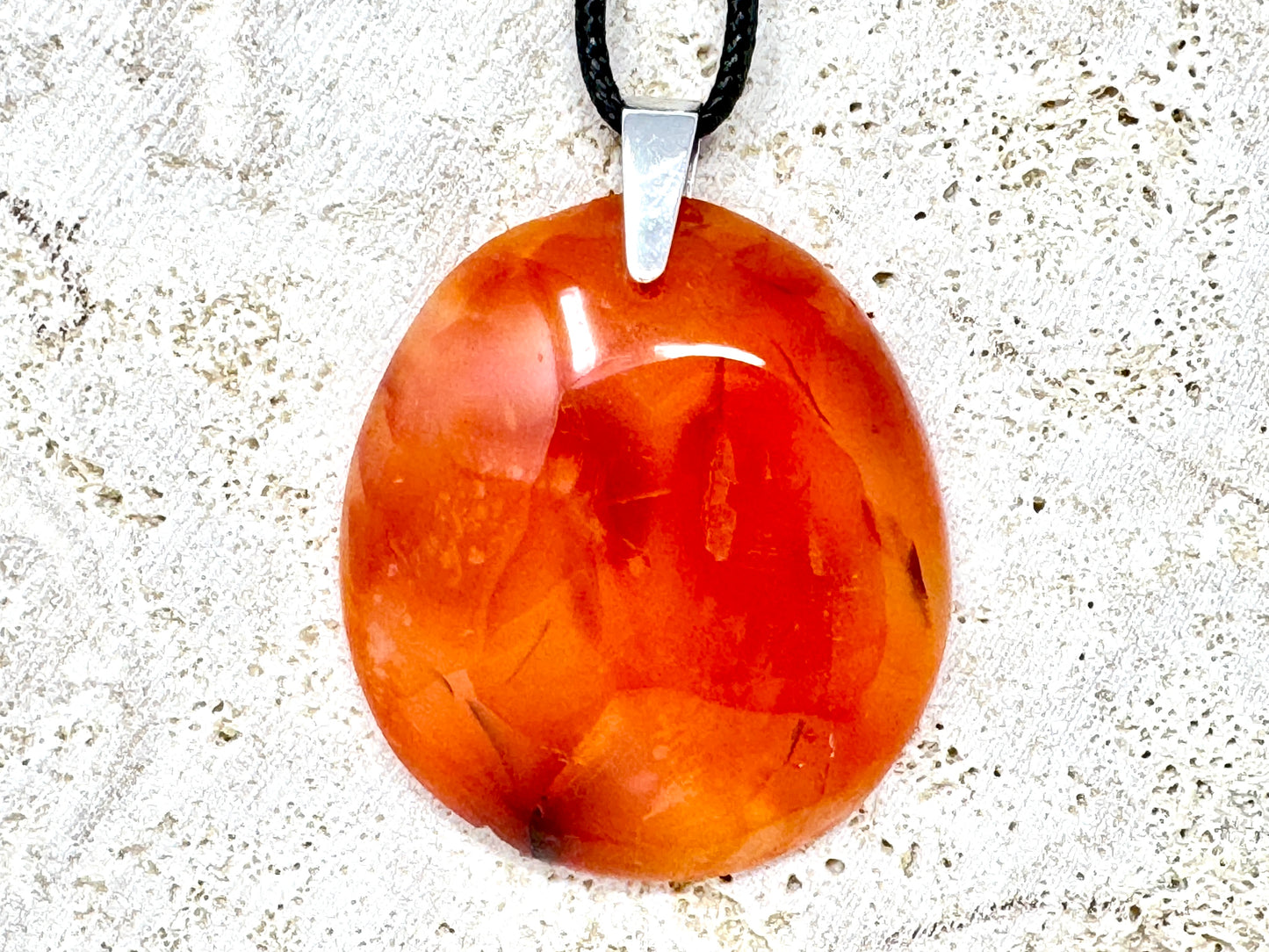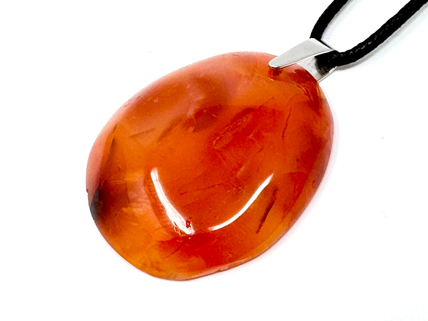 The Carnelian Pendant has been drilled and set with a Tarnish-Resistant Rhodium-Plated Stamped 925 Silver Bail, making it perfect for attaching to a chain to make a Carnelian Necklace and other types of Carnelian Jewellery.