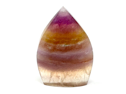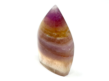 This Pastel Rainbow Fluorite Freeshape displays a sleek, curved Free Standing Crystal Freeform Shape, making it perfect as a crystal display piece for home decor.