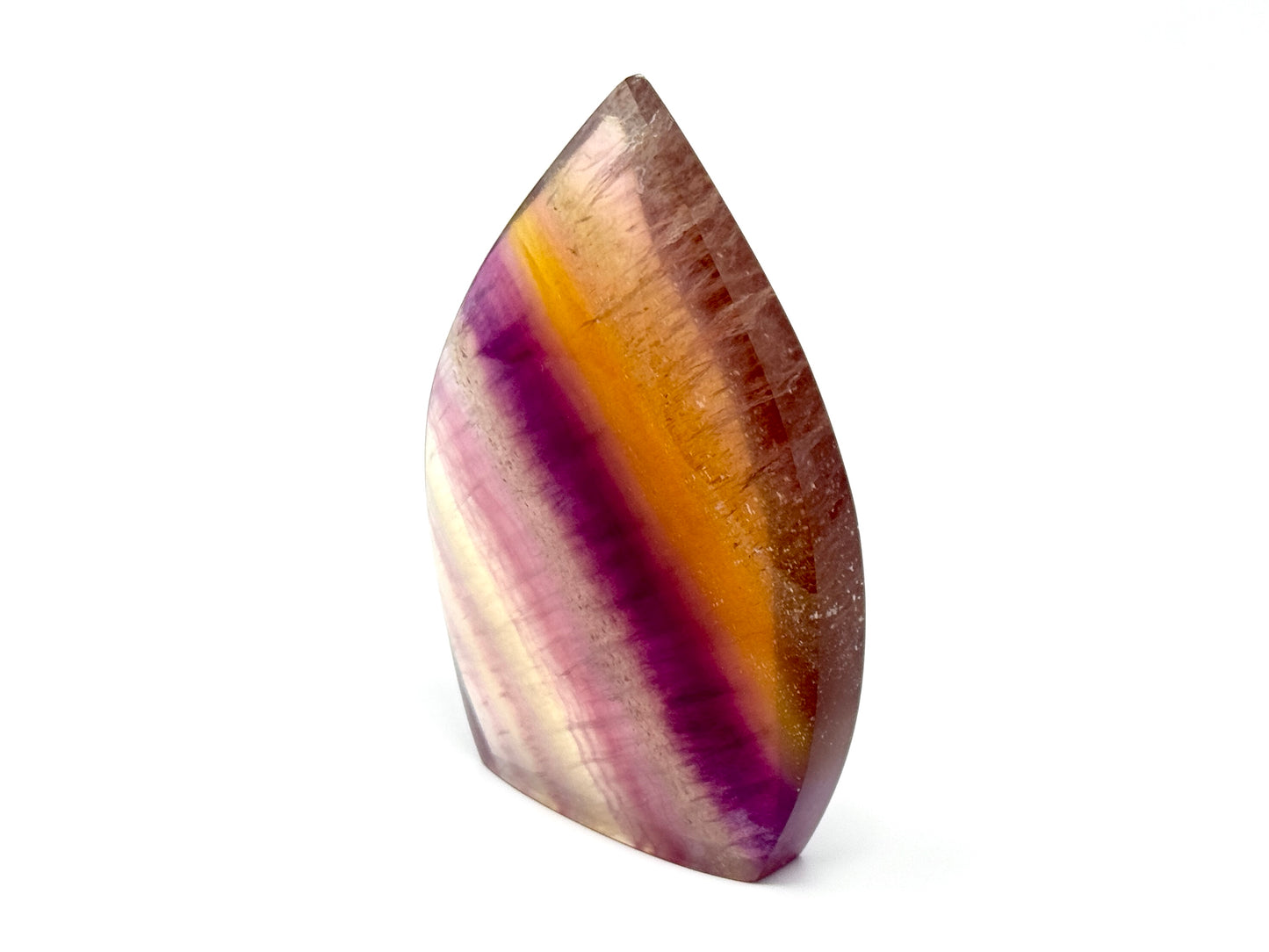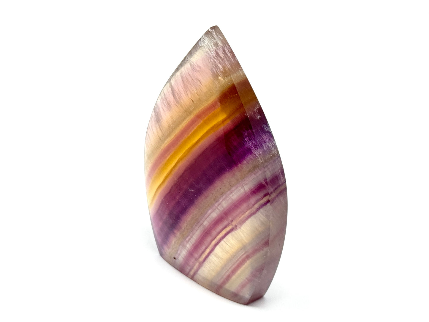 This Pastel Rainbow Fluorite Freeshape displays a sleek, curved Free Standing Crystal Freeform Shape, making it perfect as a crystal display piece for home decor.