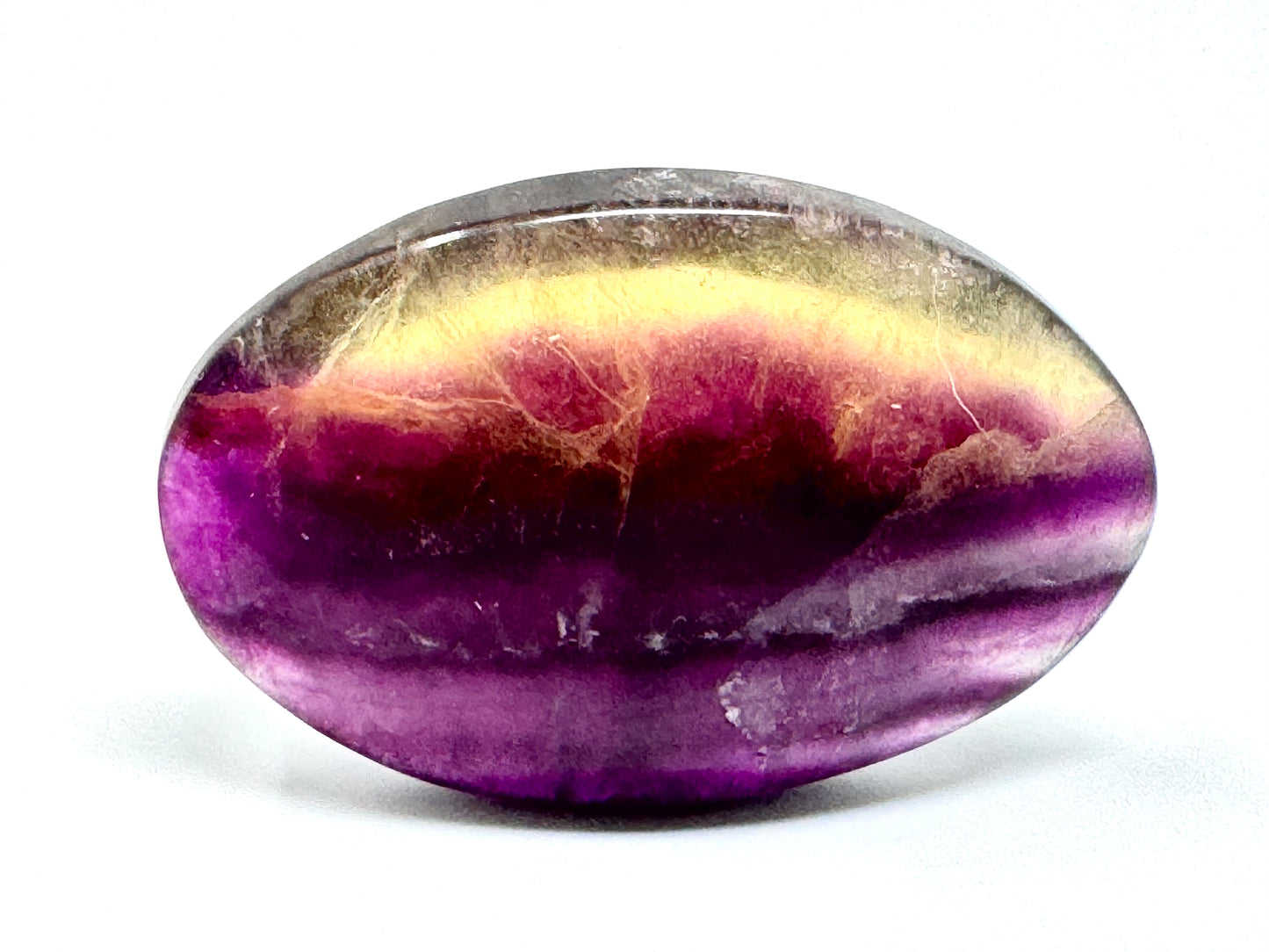 The hand-polished Pastel Rainbow Fluorite Palm Stone (or Candy Fluorite Palm Stone) is of a very high grade, displaying bands of vivid Purple Fluorite amidst stunning Yellow Fluorite/ Golden Fluorite and pink-red Raspberry Fluorite, which complement each-other to create a radiant effect.