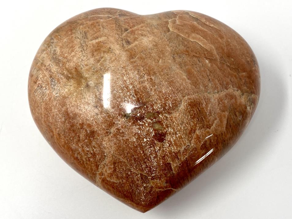 This gorgeous Large Peach Moonstone Heart Crystal measures 10.1cm wide and displays beautiful tan, orange, and pink-peach hues with a stunning silvery shimmer and flash owing to its Feldspar composition.