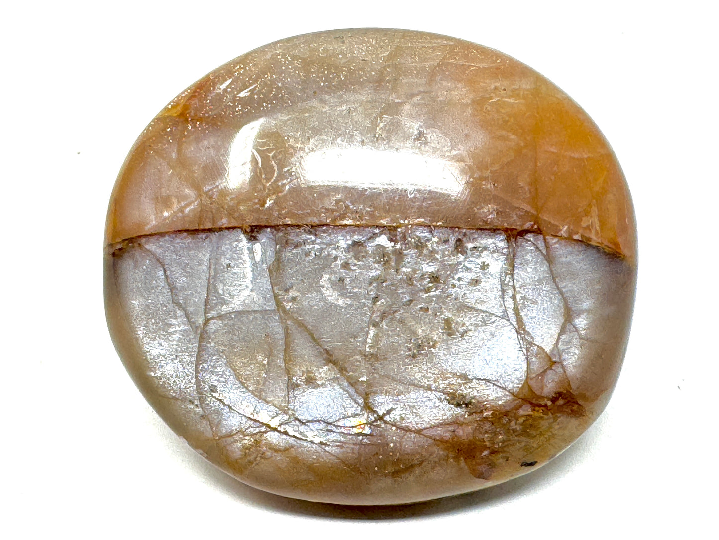 This gorgeous Flashy Peach Moonstone Pebble (otherwise known as a Flashy Peach Moonstone Palm Stone) measures 4.6cm long and displays beautiful tan, orange, and pink-peach hues with a stunning silvery-blue shimmer and flash owing to its Feldspar composition.