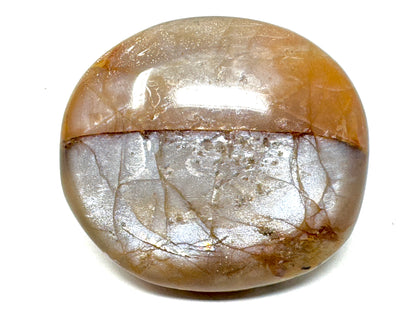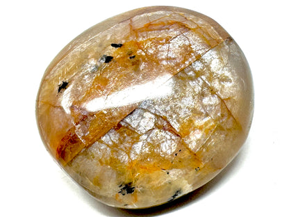 This delightful Flashy Peach Moonstone Palm Stone would make a great addition to any Moonstone collection alongside Green Moonstone, Black Moonstone, and Rainbow Moonstone.