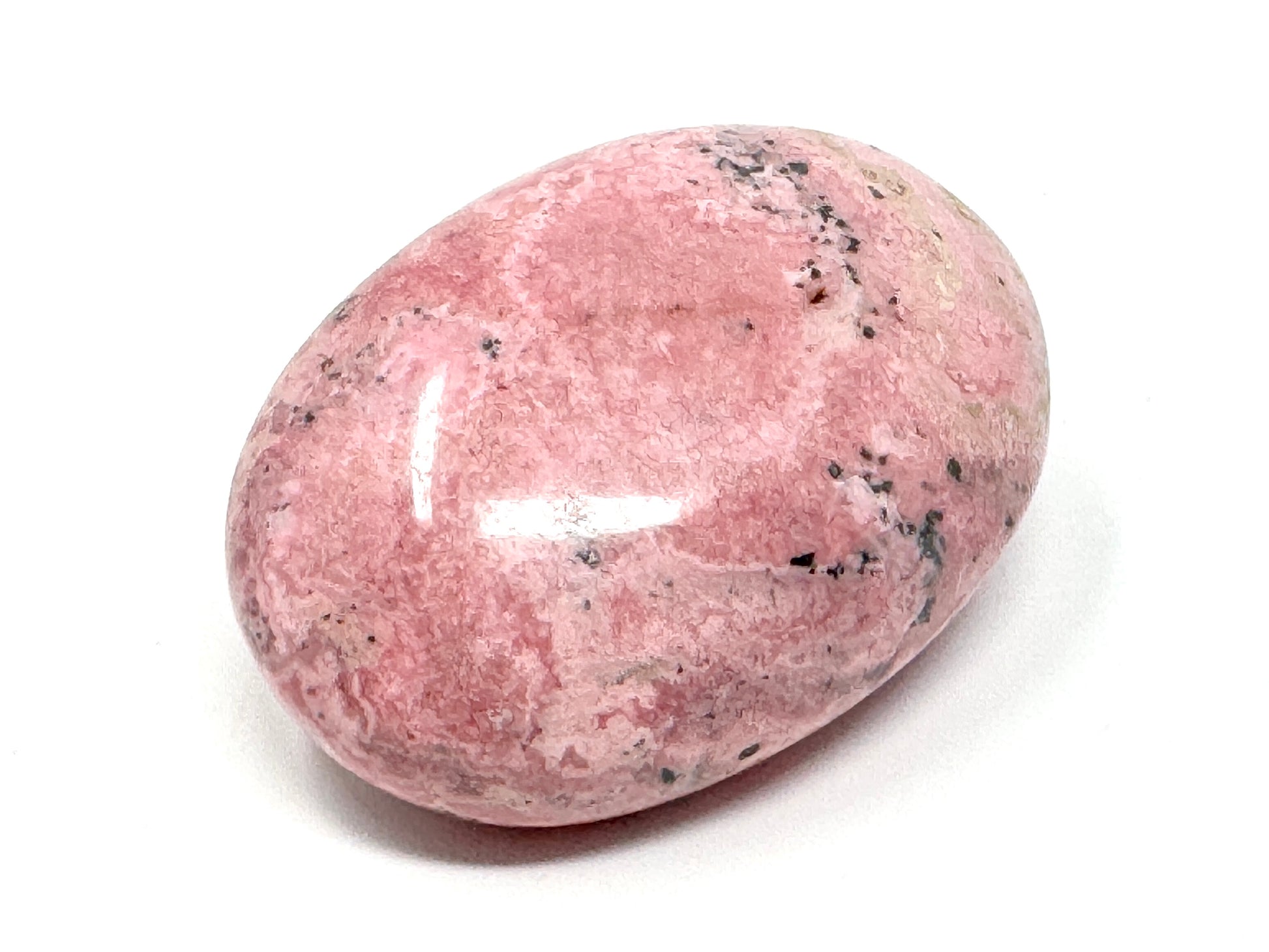 The Peruvian Rhodonite Stone has been carefully hand-polished to give a smooth finish, and as the Peruvian Rhodonite crystal lends itself well to being carved or worked, has been artfully transformed into a tactile Peruvian Rhodonite crystal palm stone shape or Peruvian Rhodonite crystal pebble shape which fits perfectly in the hand.