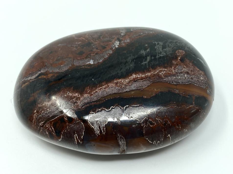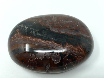 Displaying a stunning kaleidoscope of vibrant colours, including streaks of dark red, black, and white, the patterns of this Petrified Wood palm stone are truly mesmerising.