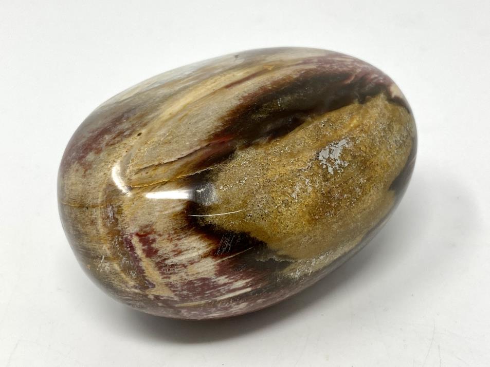 Displaying rich brown, cream, and red-purple tones, the patterns of this Petrified Wood Palm Stone are truly mesmerising.