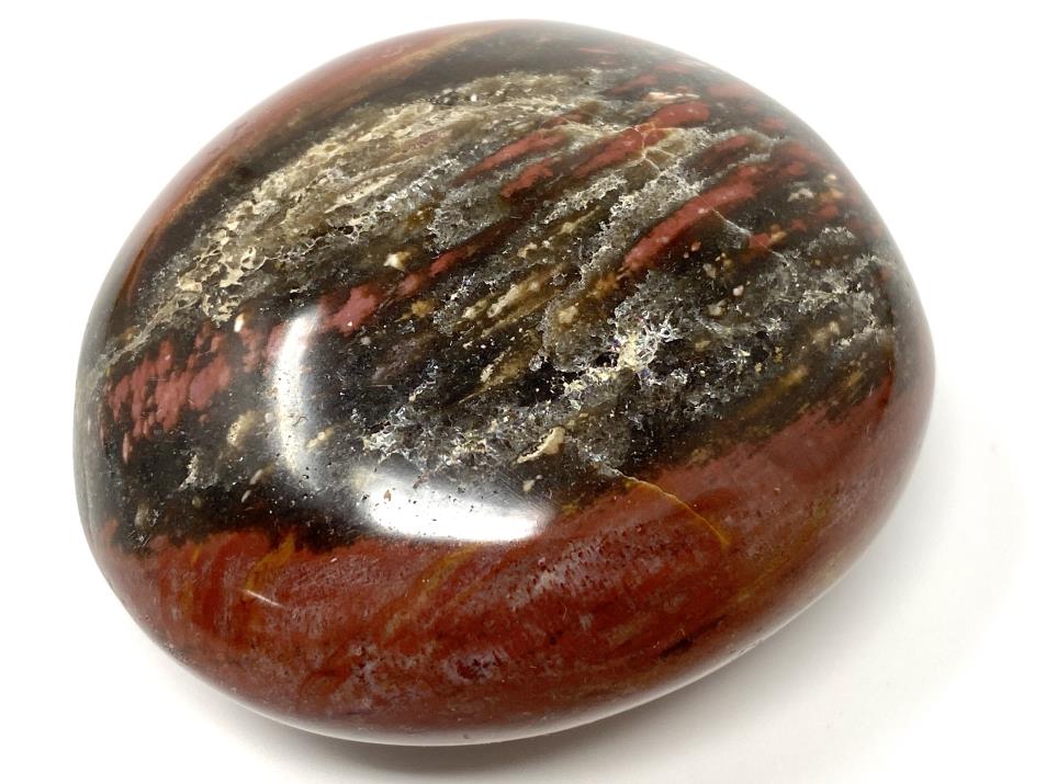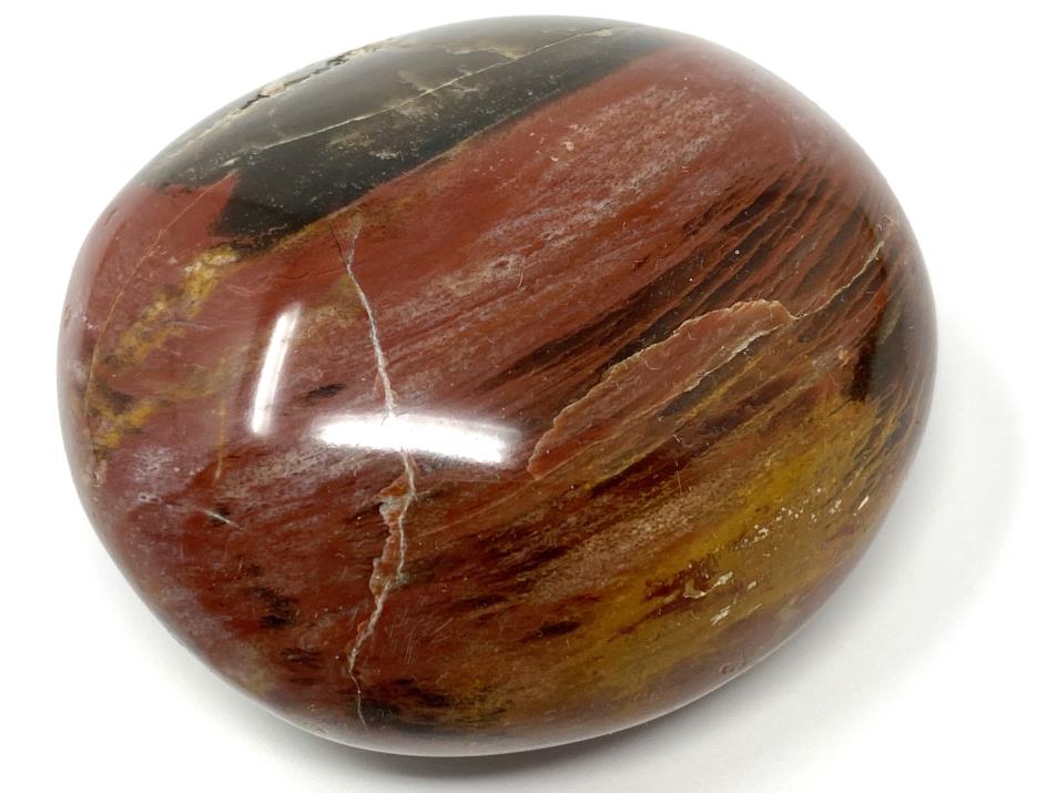 Displaying rich brown, black, and red tones, the patterns of this Petrified Wood Palm Stone are truly mesmerising.