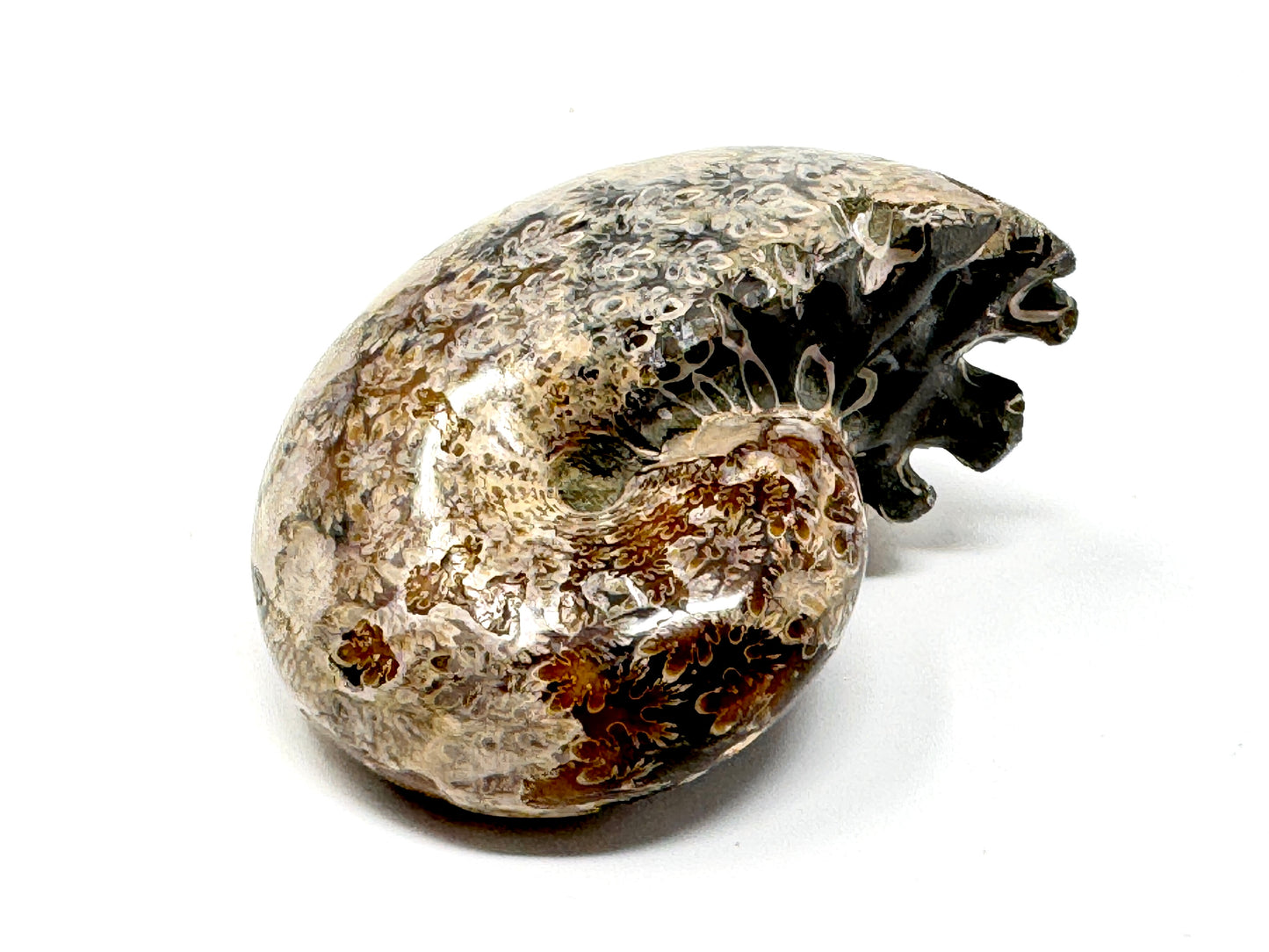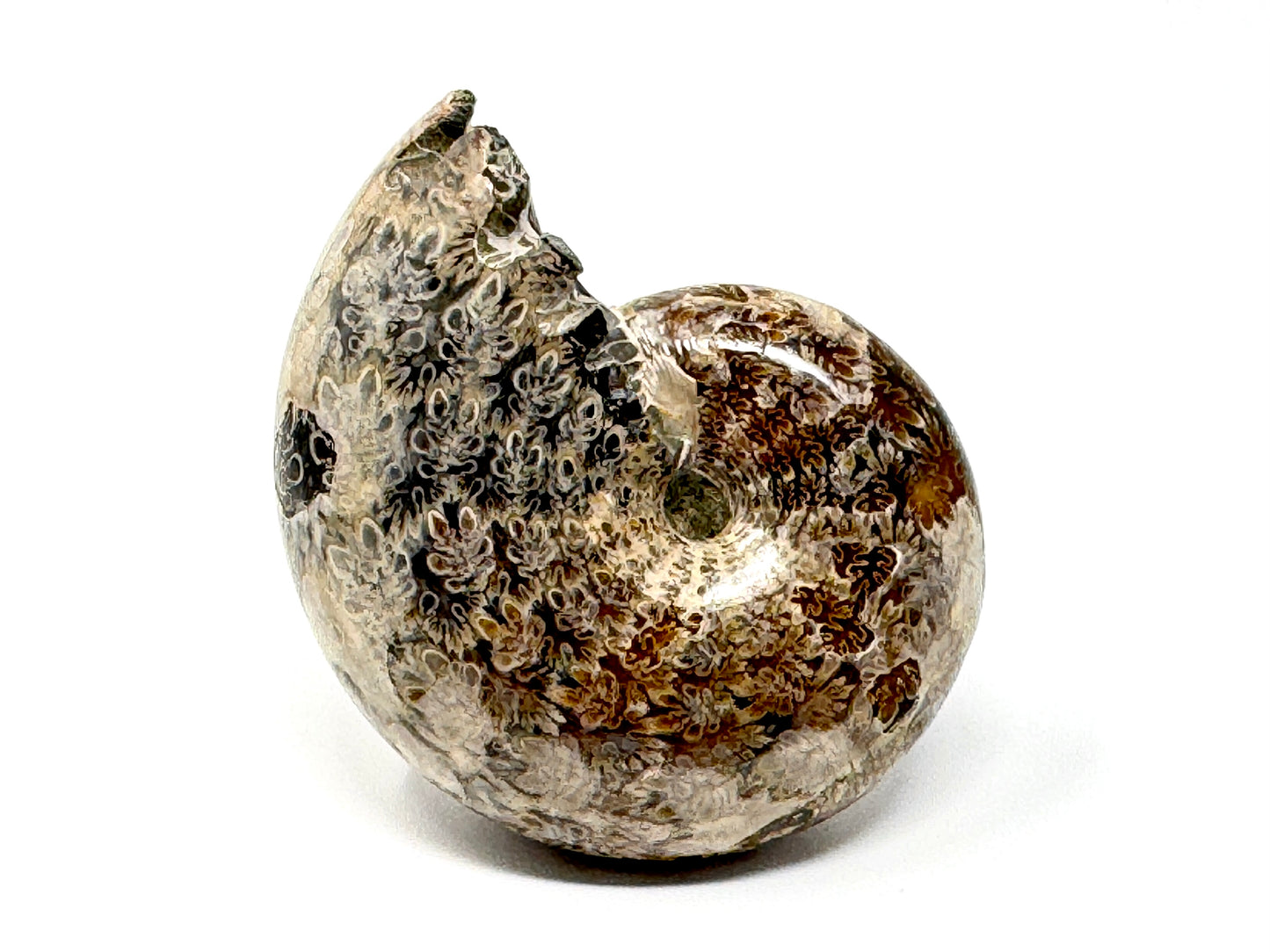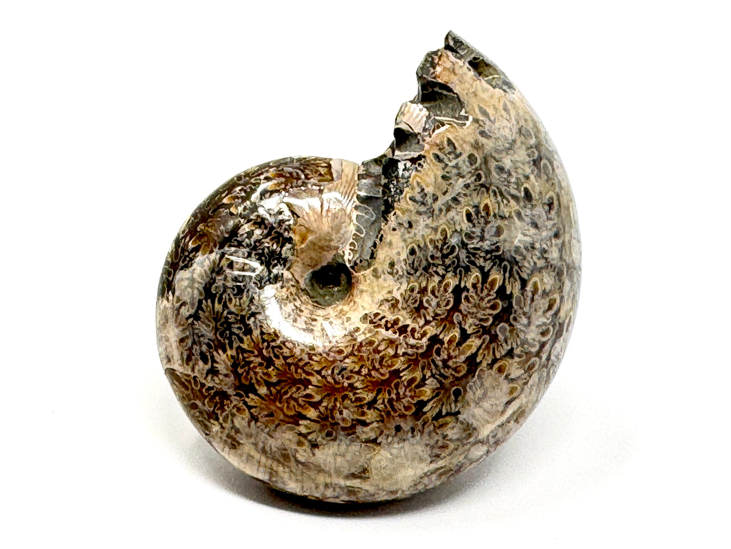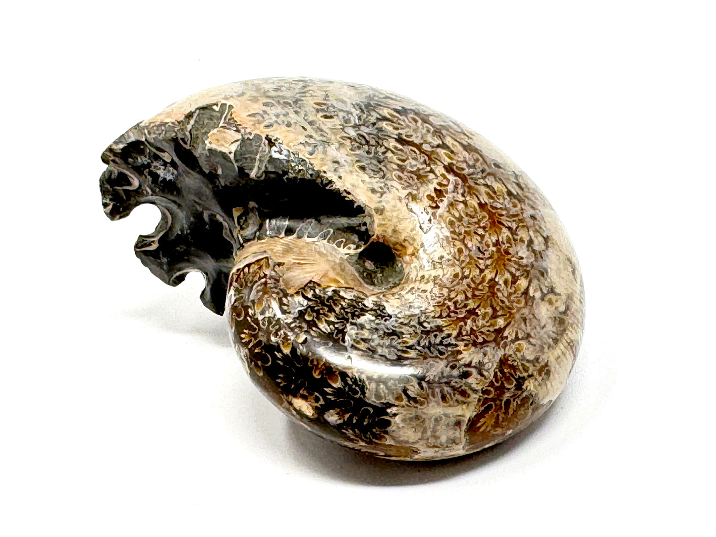 This stunning, high-grade Polished Ammonite Fossil from Madagascar, of the Phylloceras Ammonite Species, measures 6.9cm wide and has been carefully polished on top of its fossilised shell, which displays beautifully rich brown and grey colours and striking suture patterns.