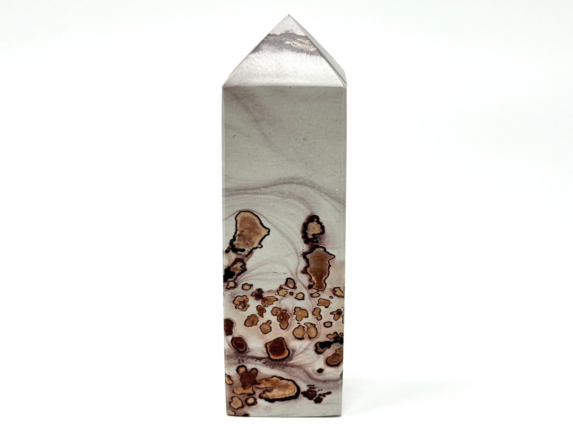 This gorgeous Picture Jasper Tower (or Picture Jasper Obelisk) measures 9.7cm tall and displays striking patterns and markings that evoke imagery of landscapes and paintings.