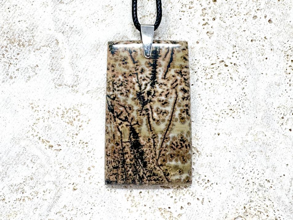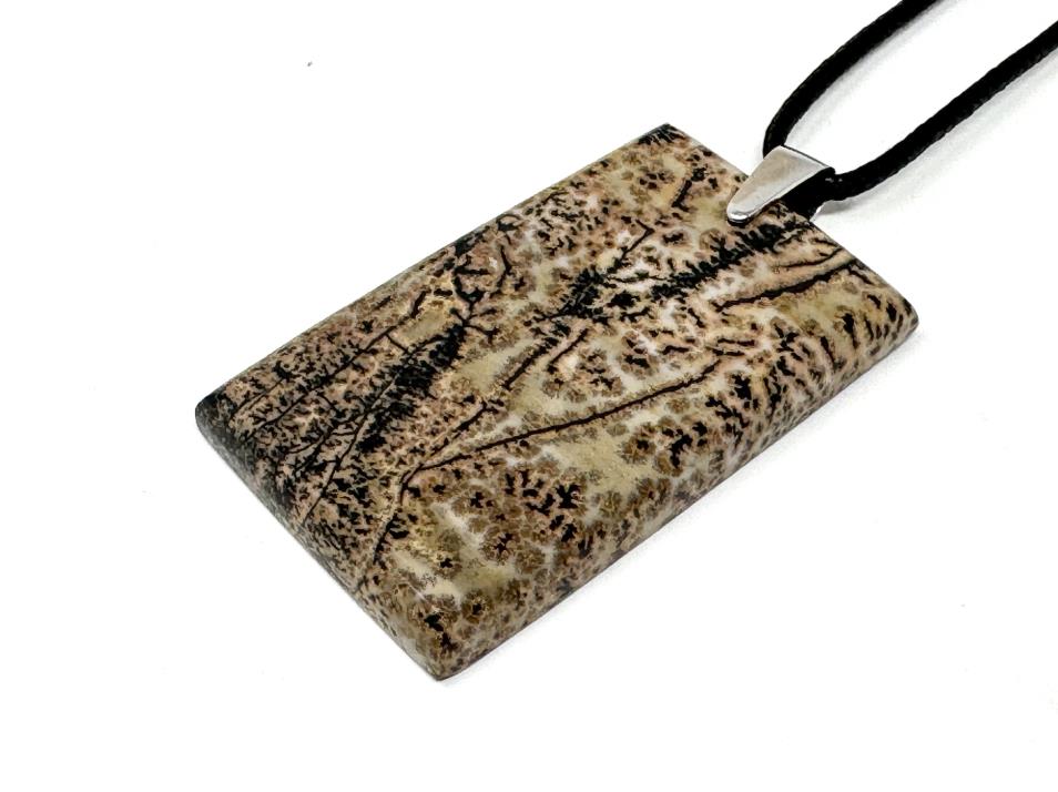 This gorgeous Picture Jasper Pendant measures 4.8cm long and displays striking patterns and markings that evoke imagery of landscapes and paintings.