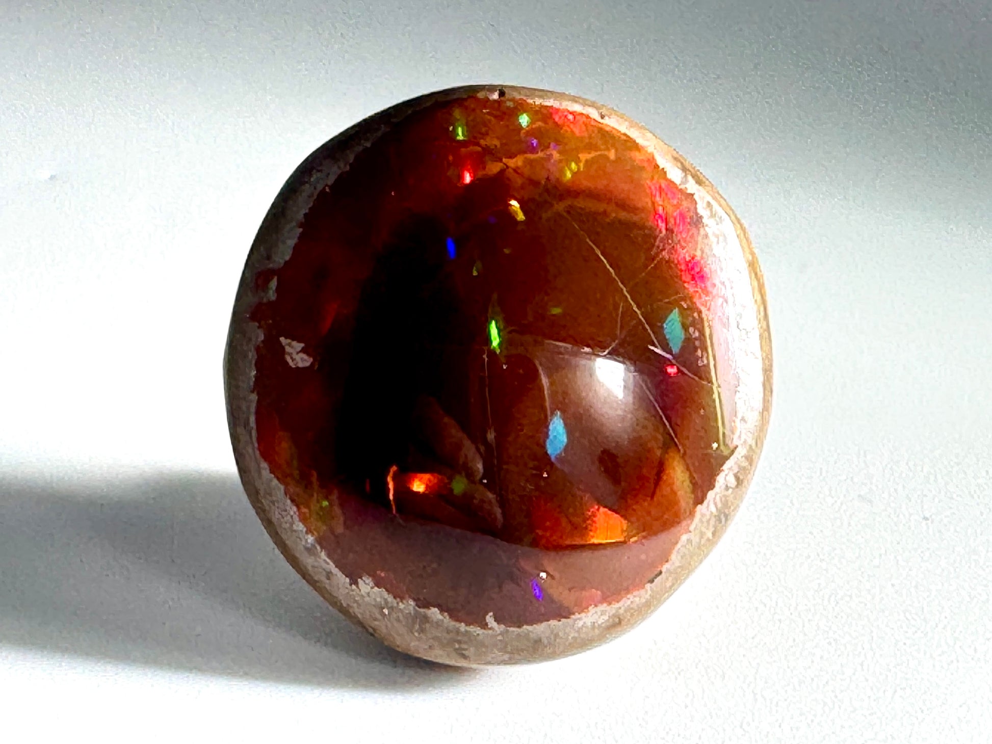 The Chocolate Opal body colour is a lovely rich chocolate brown hue, whilst the opalescent play of colour dances and flashes mesmerisingly in an array of fiery hues; usually in shades of red, green, yellow, and orange that creates an iridescent effect akin to the fiery flash of Fire Opals, Ammolite, and Fire Ammonites (also known as Red Iridescent Ammonites).
