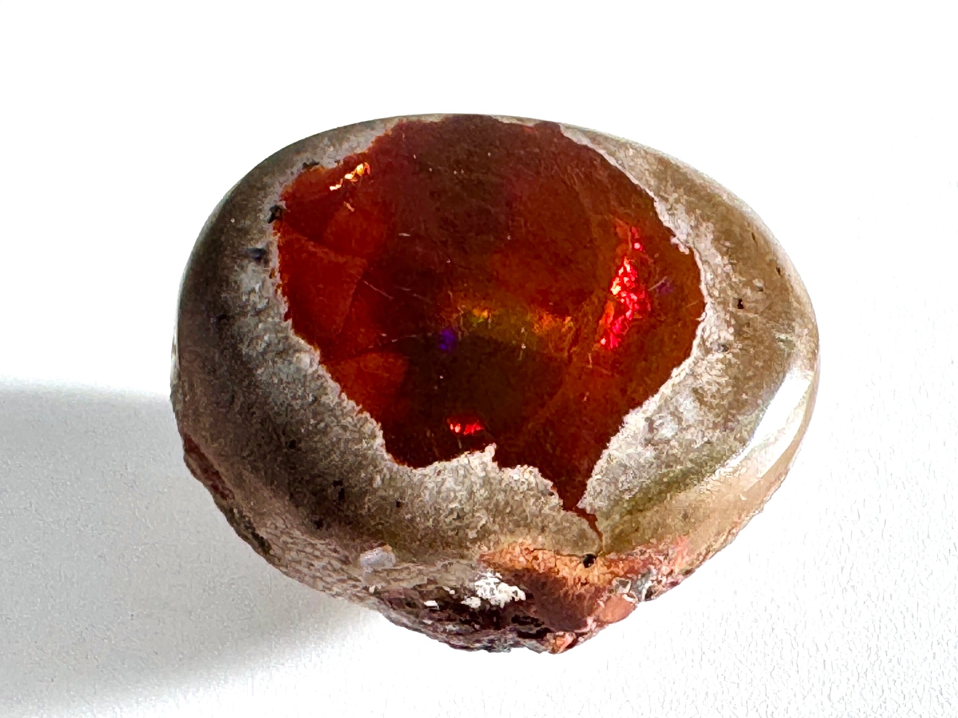The Chocolate Opal body colour is a lovely rich chocolate brown hue, whilst the opalescent play of colour dances and flashes mesmerisingly in an array of fiery hues; usually in shades of red, green, yellow, and orange that creates an iridescent effect akin to the fiery flash of Fire Opals, Ammolite, and Fire Ammonites (also known as Red Iridescent Ammonites).
