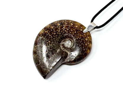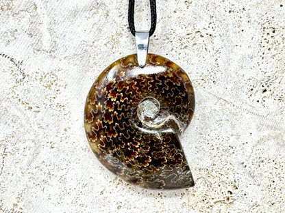 This stunning hand-made Polished Cleoniceras Ammonite Fossil Pendant, created from a Real Ammonite Fossil of the Cleoniceras Ammonite Species, is a highly unique Ammonite Accessory and Fossil Accessory.