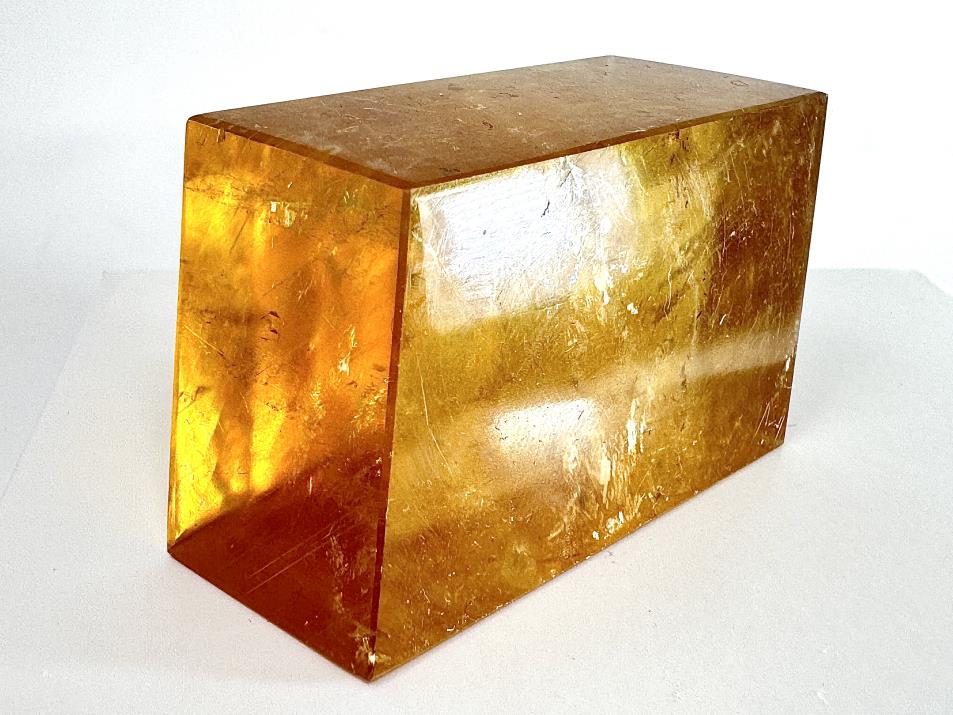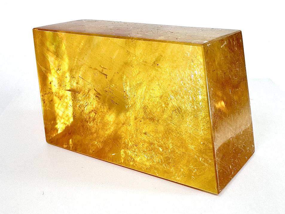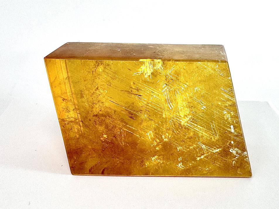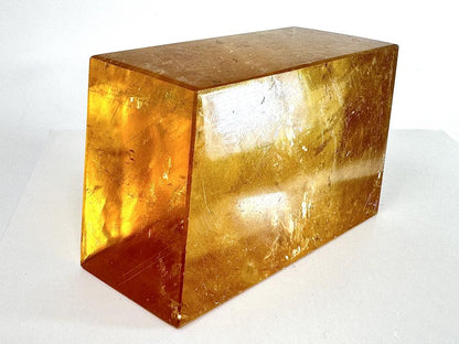 The crystal displays gorgeous golden-yellow hues, hence its name of Honey Calcite, and retains the crystal-clear transparency, shimmer and rainbows of Optical Calcite/ Iceland Spar.