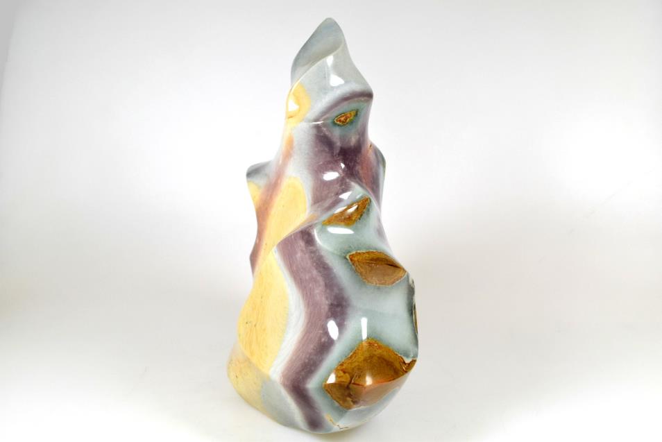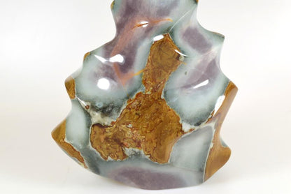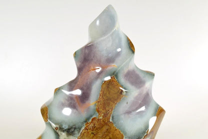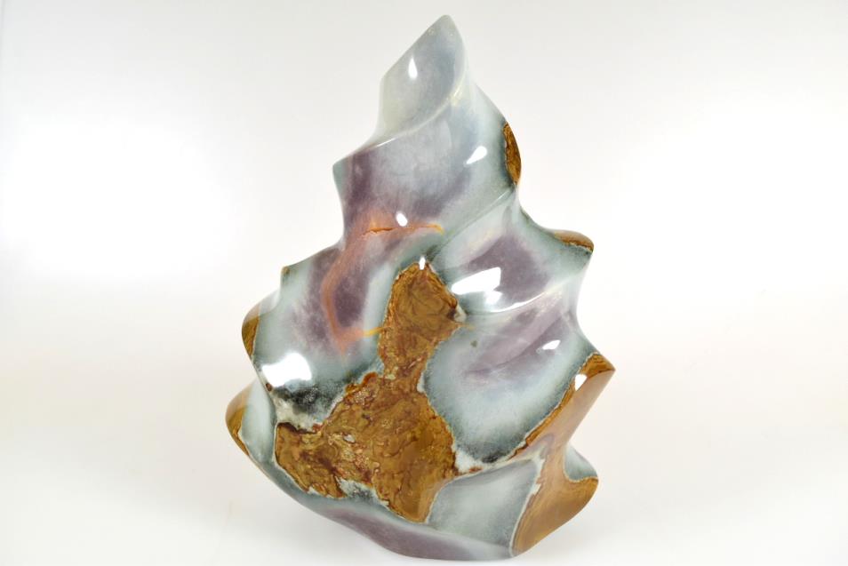 This striking Large Polychrome Jasper Flame Crystal showcases stunning swirls and circular patterns, and displays a free-standing base.
