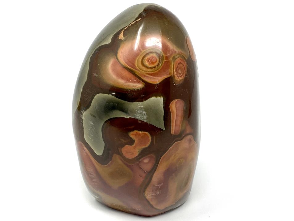 This striking Large Polychrome Jasper Free Shape Crystal showcases stunning swirls and circular patterns, and displays a free-standing base.