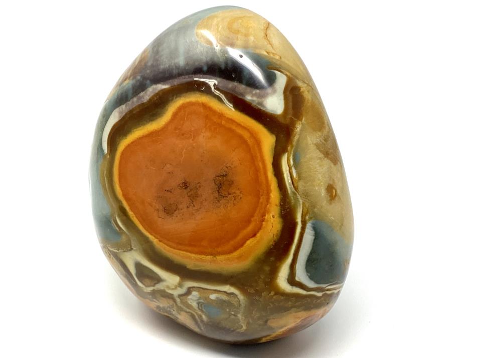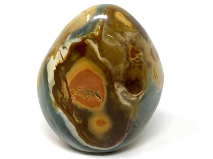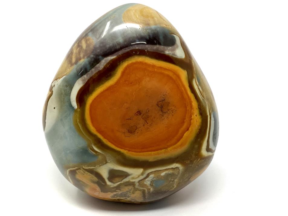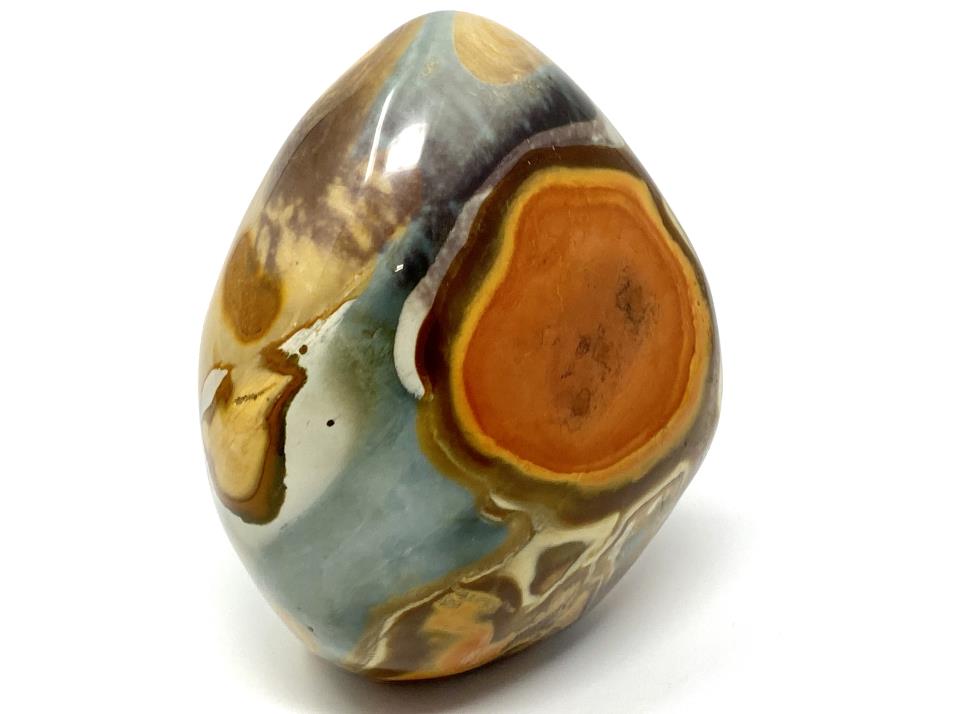 This striking Large Polychrome Jasper Free Shape Crystal showcases stunning swirls and circular patterns, and displays a free-standing base.