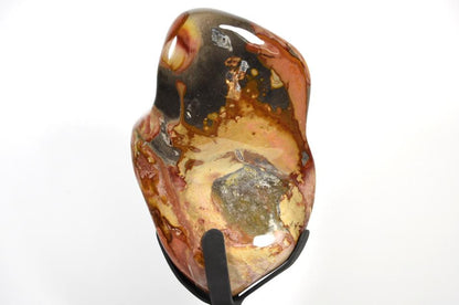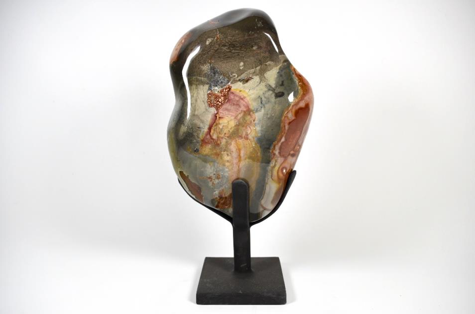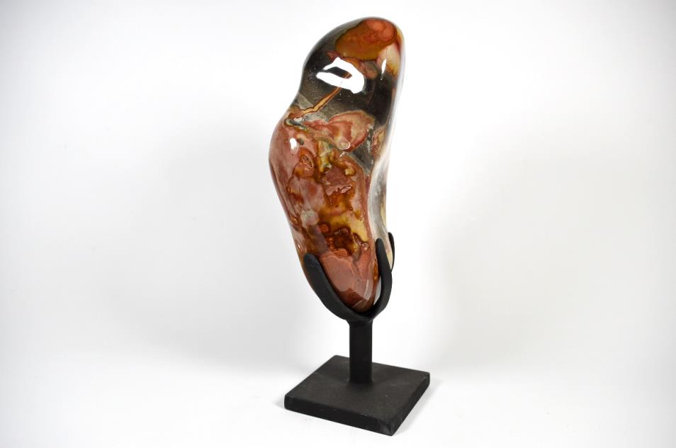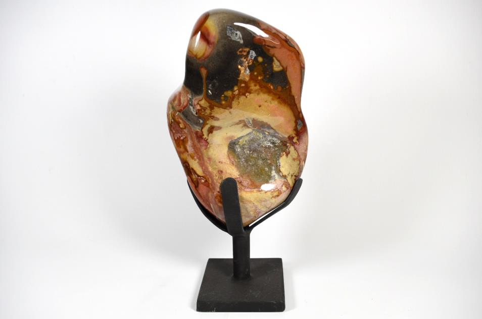This striking Large Polychrome Jasper Free Shape Crystal showcases stunning swirls and circular patterns, and has been mounted on a metal stand with a free-standing base.